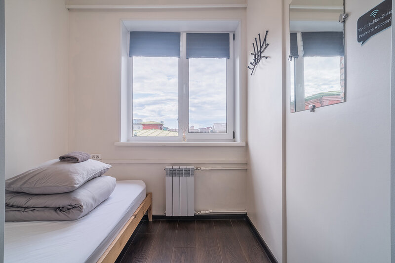 односпальная кровать, телевизор. Общая ванная комната на этаже: душ, с/у. Общая кухня с бытовыми приборами, посудой и обеденной зоной