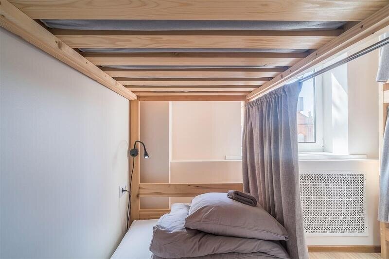 спальное место на двухъярусной кровати в 4-х местном номере для мужчин, розетка, шторка, шкаф. Общая ванная комната на этаже: душ, с/у.
