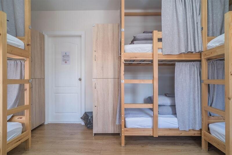 спальное место на двухъярусной кровати в 6-и местном номере для мужчин, розетка, шторка, шкаф. Общая ванная комната на этаже: душ, с/у.
