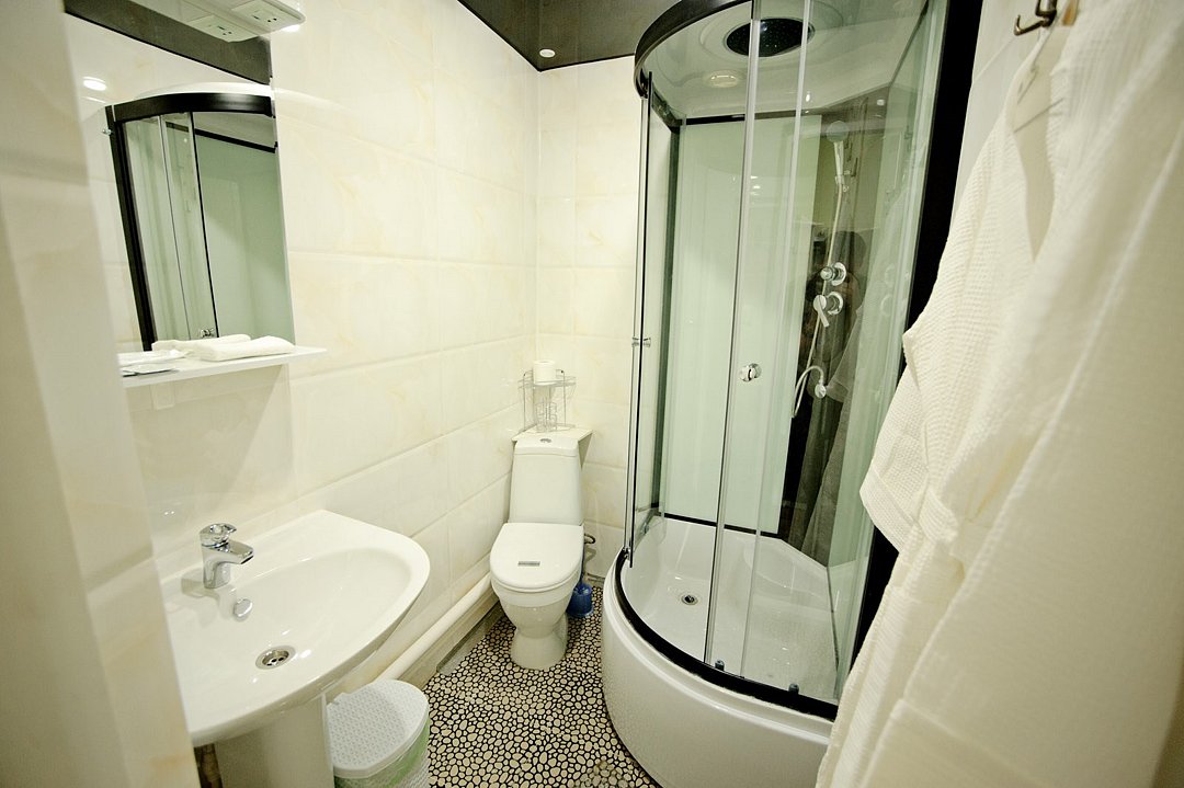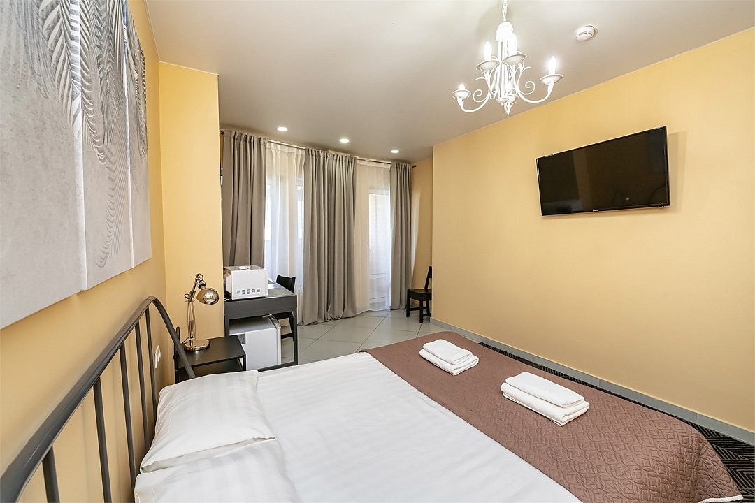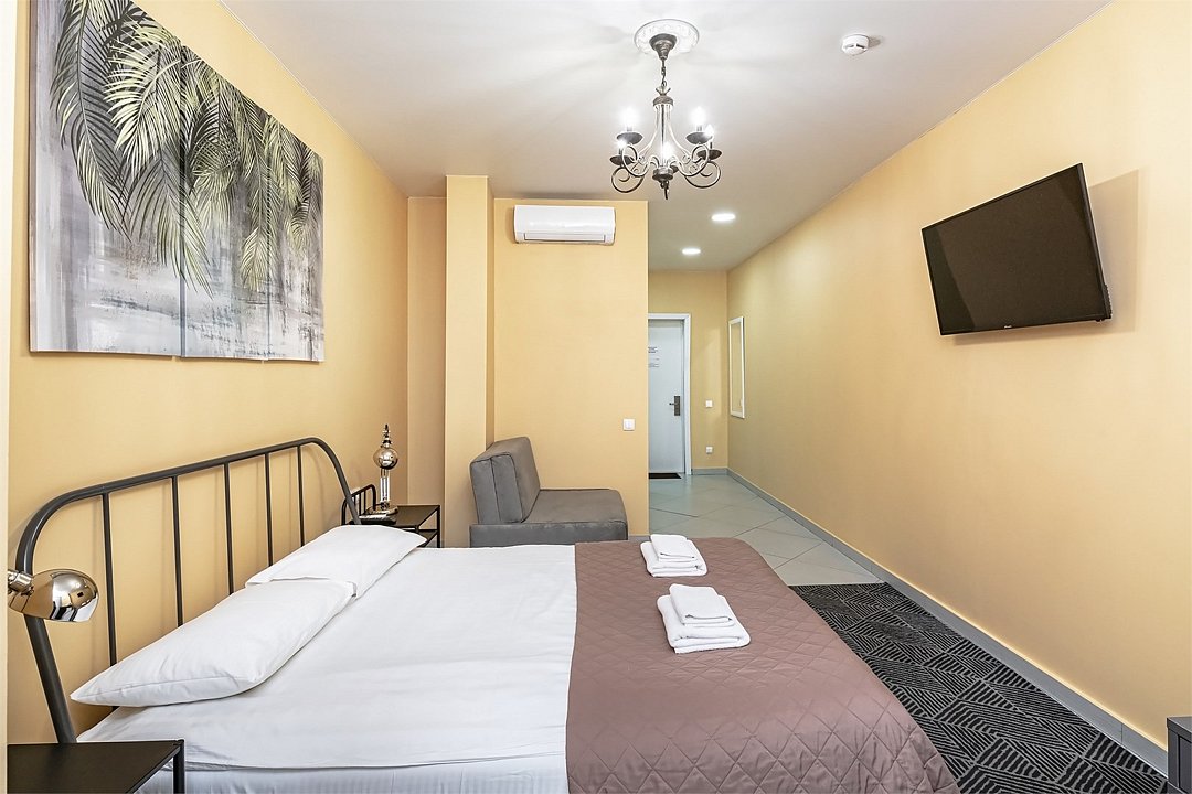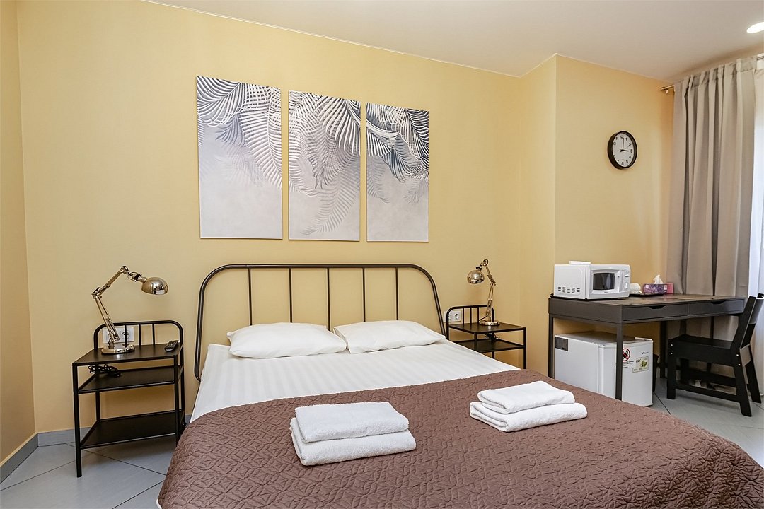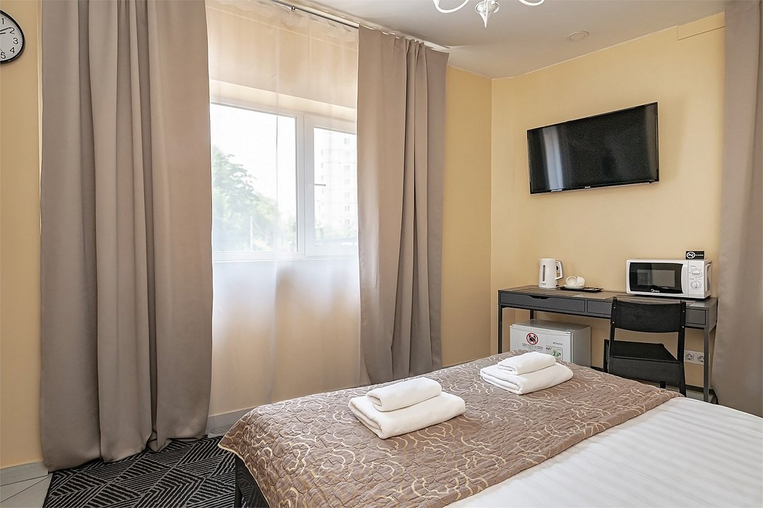 Стандарт Одна двуспальная кровать В номерах и на территории есть бесплатный Wi-Fi. Отель удачно сочетает в себе все условия как для командированных гостей , так и для семейного отдыха. Наполнение каждого номера включает: холодильник, телевизор ( цифровое TV), кондиционер, санузел с душевой кабиной (вода горячая, холодная круглосуточно), удобные спальные места.Услуги и удобства