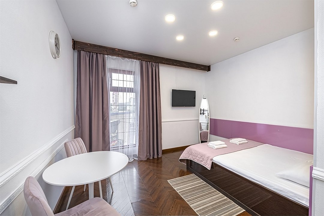 Комфорт Одна двуспальная кровать Категория «Комфорт» отличается чуть большей площадью, а также видом из окна на город. Наполнение каждого номера включает: холодильник, телевизор ( цифровое TV), кондиционер, санузел с душевой кабиной (вода горячая, холодная круглосуточно), удобные спальные места.Услуги и удобства