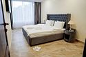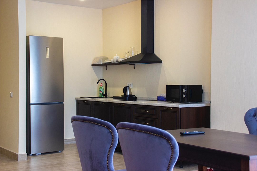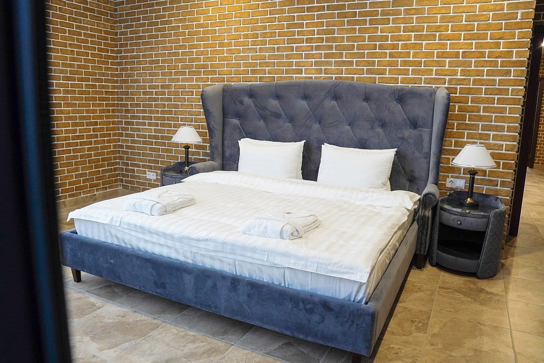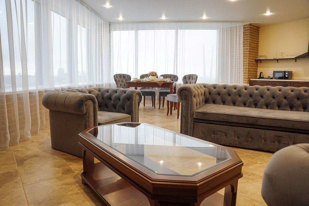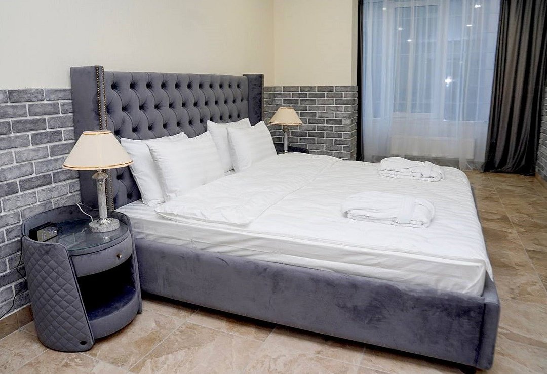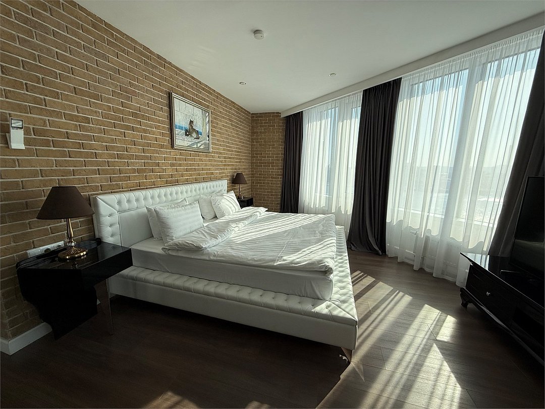 Номер оснащен спальней с кроватью King-size, кондиционером в каждой комнате, просторной ванной комнатой, кухонной зоной, плазменными телевизорами в спальне и уютной гостиной. К услугам гостей в номере: косметические принадлежности, халаты и тапочки, гладильный набор, два LED-телевизора с ТВ-приставкой, бесплатный беспроводной Wi-Fi. Вид на город. Для гостей отеля посещение тренажерного зала и сауны бесплатное. Для гостей отеля – скидка в размере 20% в СПА-зону комплекса.Услуги и удобства