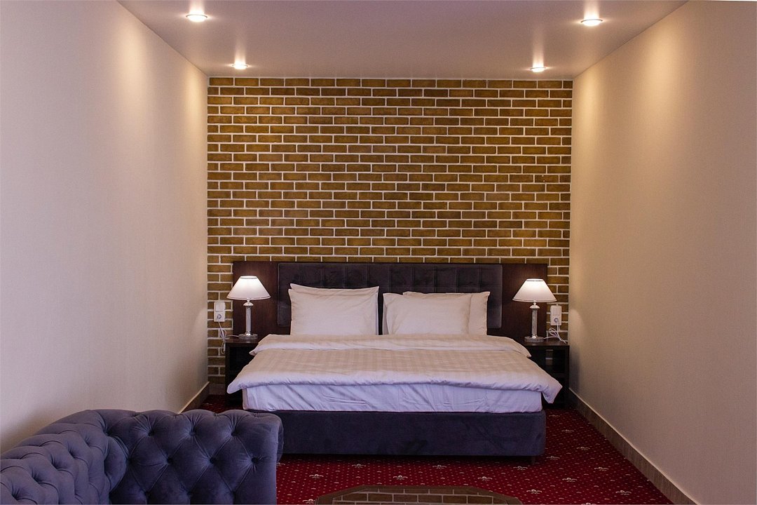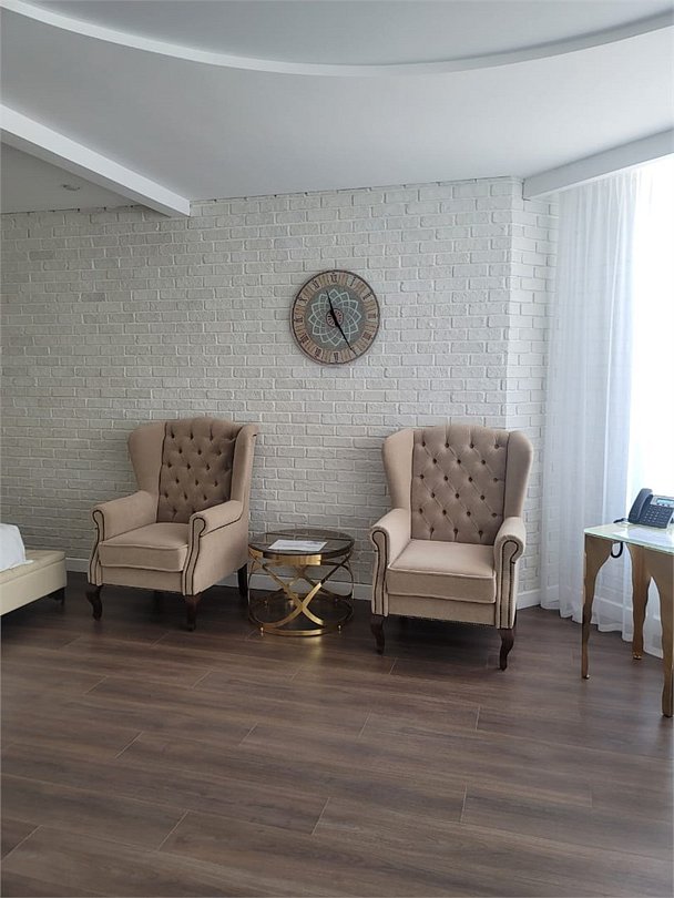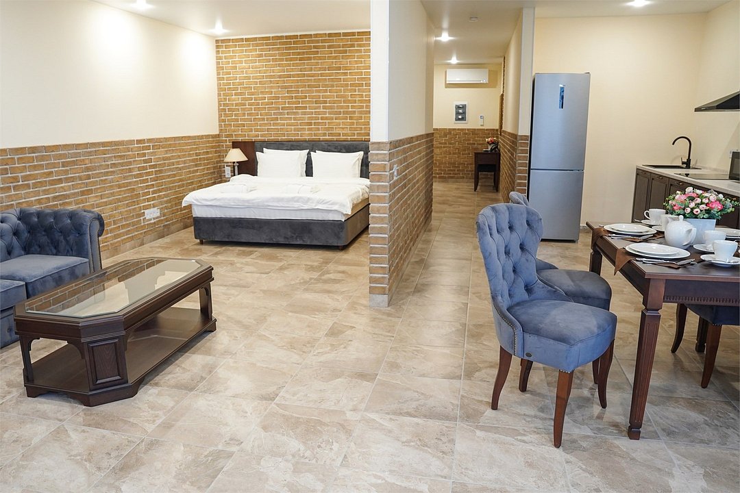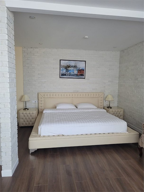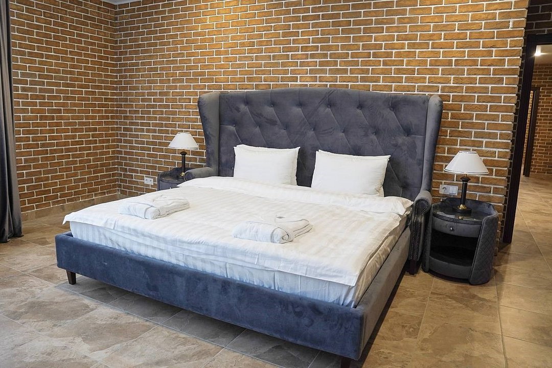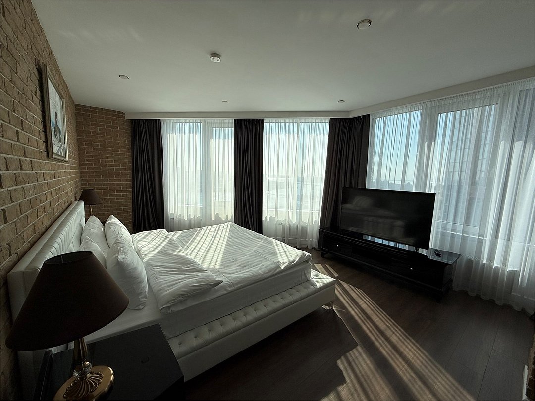 Номер оснащен спальней с кроватью King-size, кондиционером в каждой комнате, просторной ванной комнатой, кухонной зоной, плазменными телевизорами в спальне и уютной гостиной. К услугам гостей в номере: косметические принадлежности, халаты и тапочки, гладильный набор, два LED-телевизора с ТВ-приставкой, бесплатный беспроводной Wi-Fi. Вид на город. Для гостей отеля посещение тренажерного зала и сауны бесплатное. Для гостей отеля – скидка в размере 20% в СПА-зону комплекса.Услуги и удобства