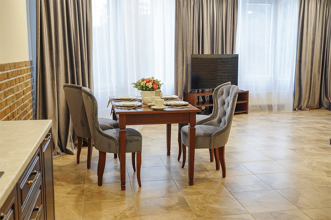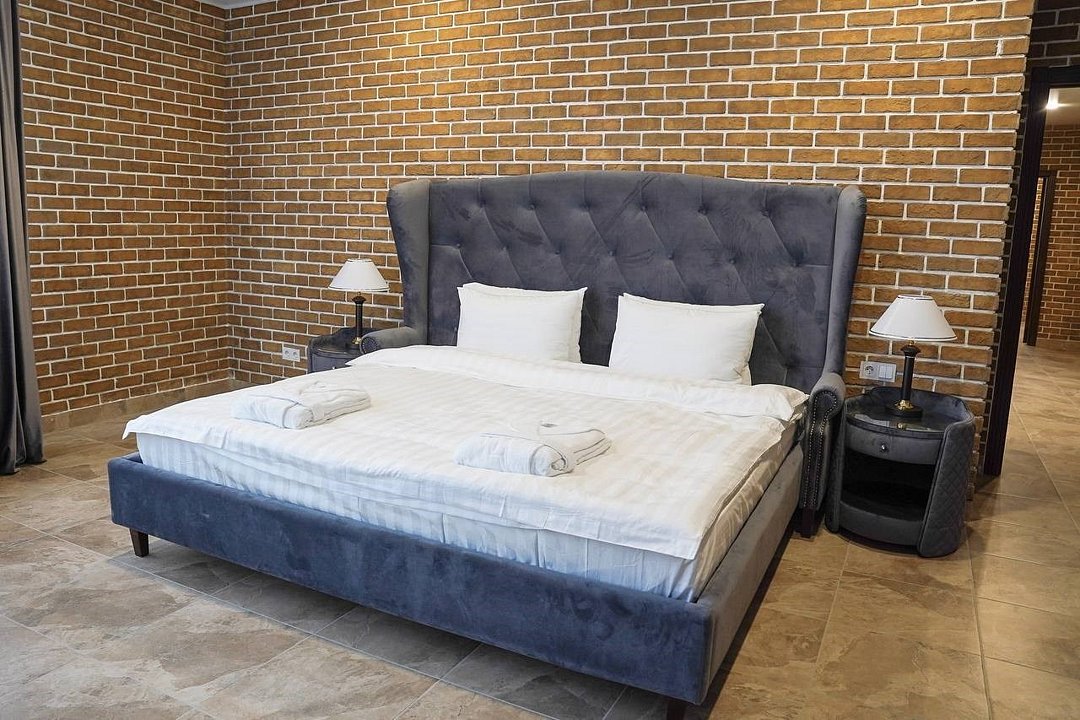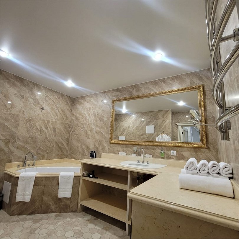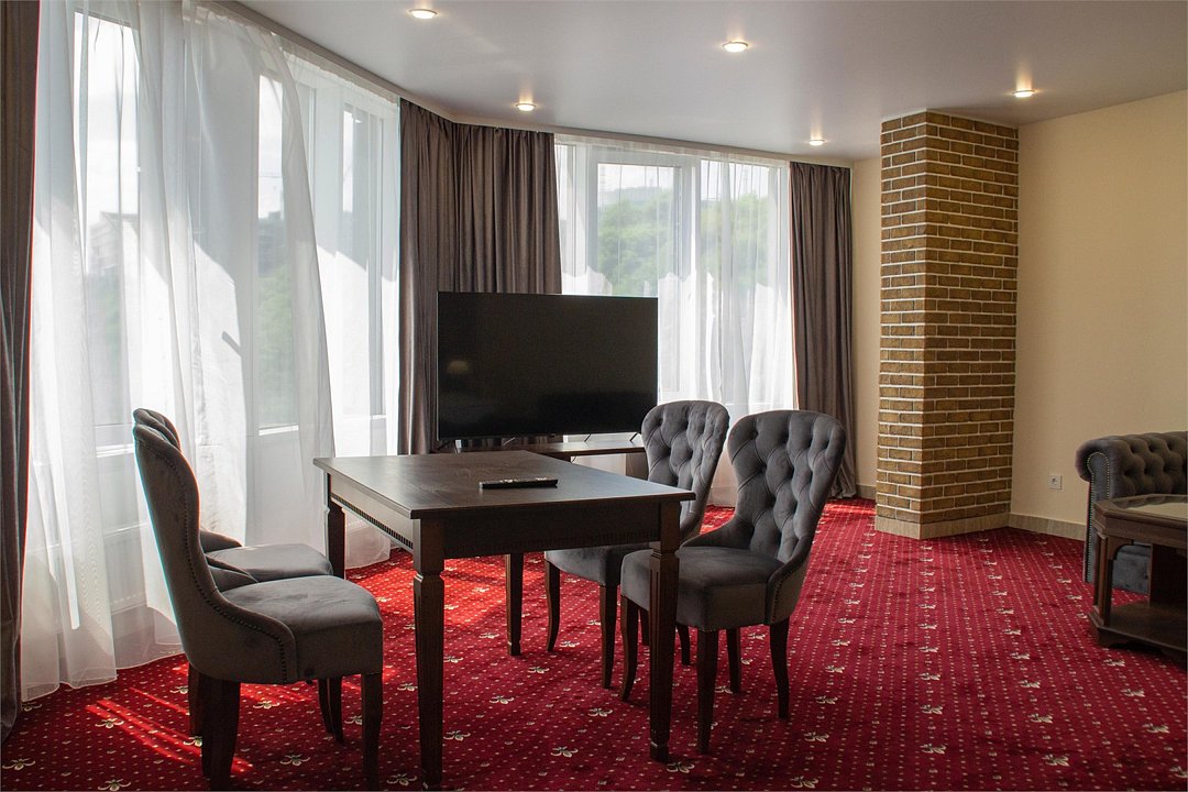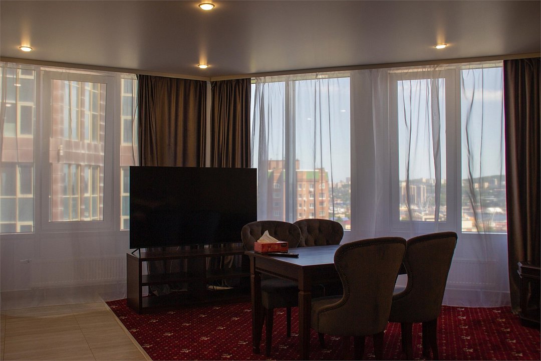 Четырехкомнатный Люкс состоит из трех спален, просторной и функциональной кухни, уютной гостиной и гардеробной. Кухня оснащена всем необходимым для приготовления пищи: варочная панель, духовой шкаф, микроволновая печь, холодильник, набор посуды и столовых приборов. К услугам гостей в номере: косметические принадлежности, халаты и тапочки, гладильный набор, три LED-телевизора с ТВ-приставкой, бесплатный беспроводной Wi-Fi. Вид на город. Для гостей отеля – скидка в размере 20% в СПА-зону комплекса.Услуги и удобства