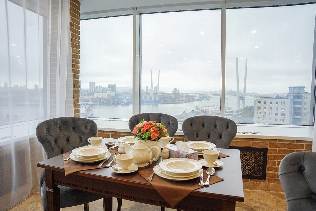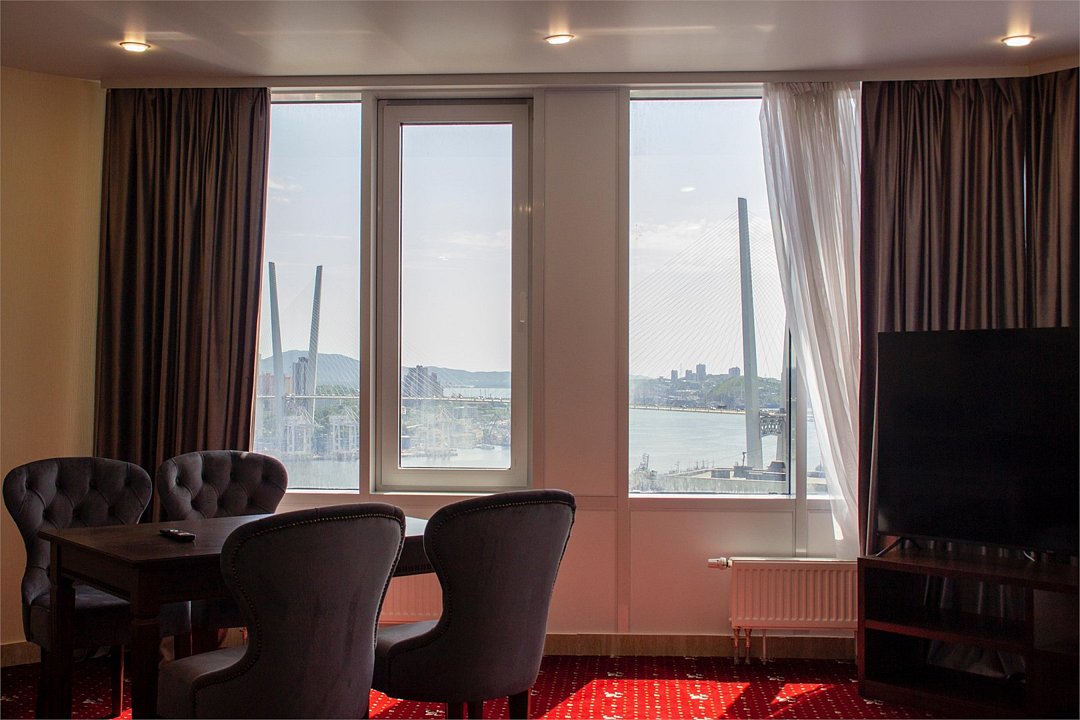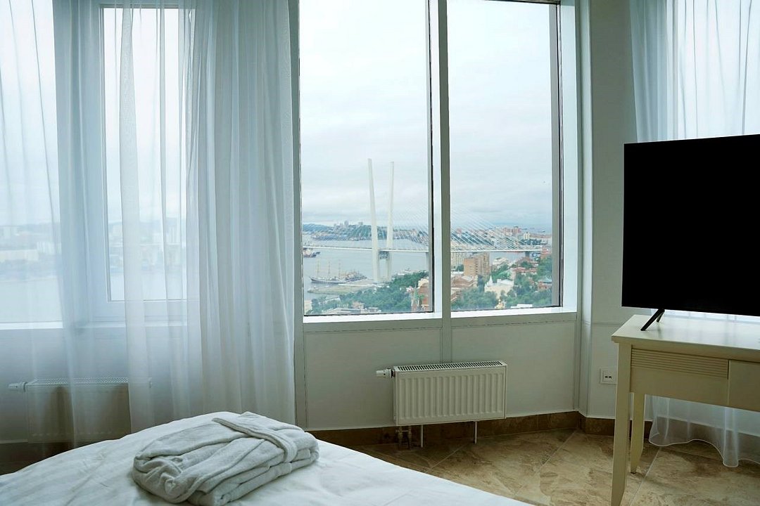 Номер оснащен спальней с кроватью King-size, кондиционером, просторной ванной комнатой, кухонной зоной. К услугам гостей в номере: косметические принадлежности, халаты и тапочки, гладильный набор, LED-телевизор с ТВ-приставкой, бесплатный беспроводной Wi-Fi. Вид на залив и вид на город. Для гостей отеля – скидка в размере 20% в СПА-зону комплекса.Услуги и удобства