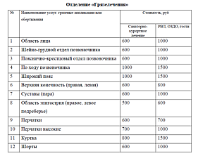 Отделение грязелечения: местные аппликации, общие обертывания, а также грязевые обертывания и/или аппликации на теплых каменных кроватях (природный камень серпентинит или змеевик).