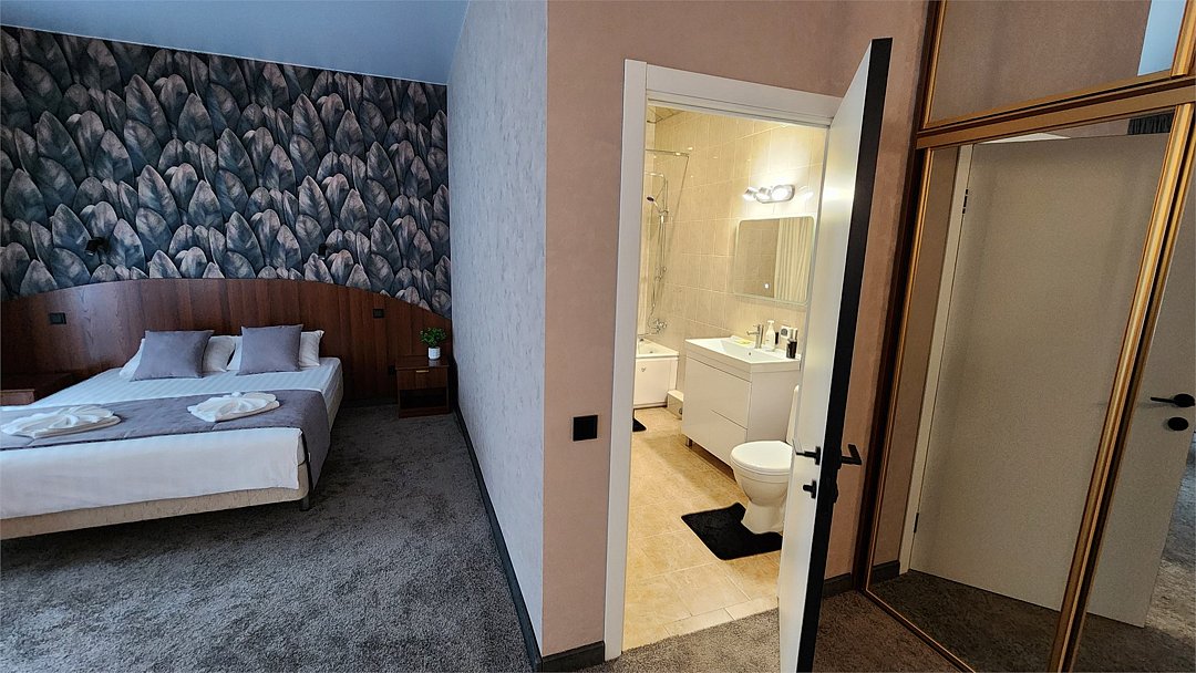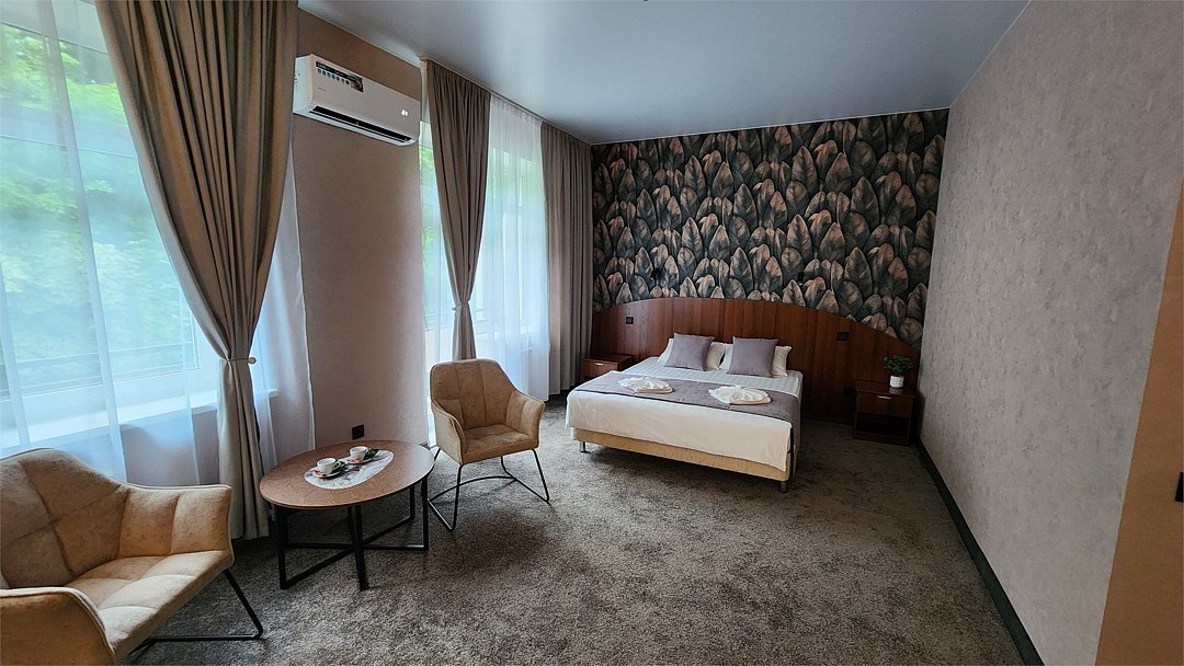 Wi-Fi, телефон, холодильник, кондиционер, светильник, фен, ванная комната, ванна, халаты, банные полотенца, тапочки, гигиенические средства, балкон, двуспальная кровать, кресла, тумбы, стулья, шкаф для одежды, журнальный столик, зеркало, унитаз, раковина, душ, кулер на этаже, вид во двор, туалетный столик, туалетные средства, туалет, раскладное кресло, телевизор с плоским экраном, шкаф-купе, вид на лес, рабочий стол, морозильная камера, без питомцевВ номере