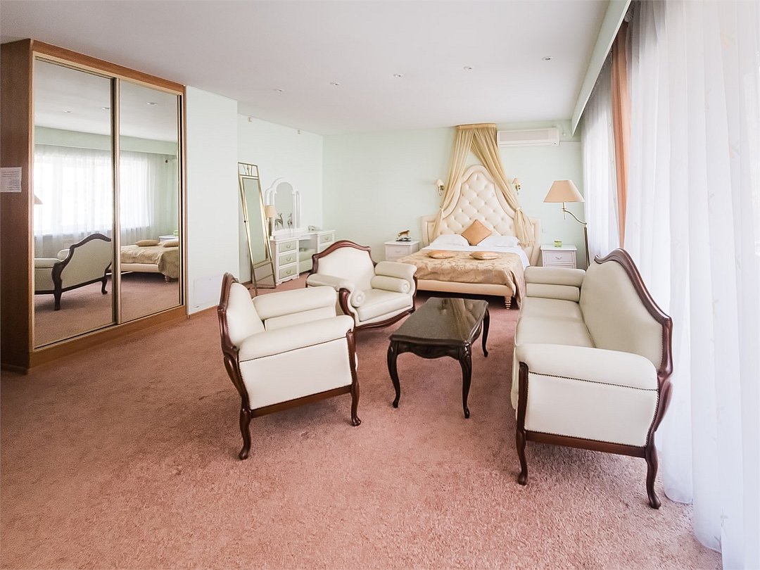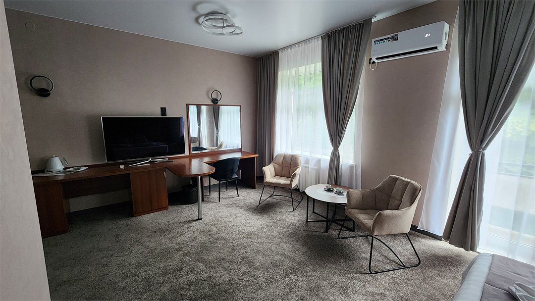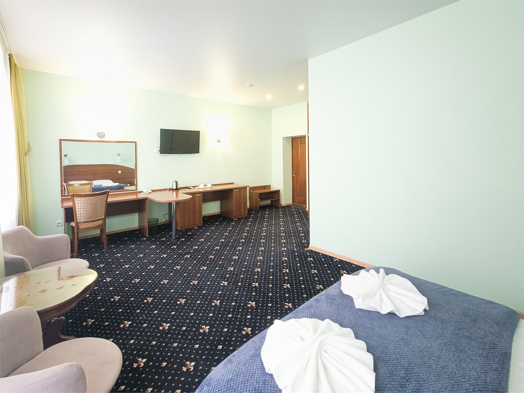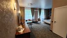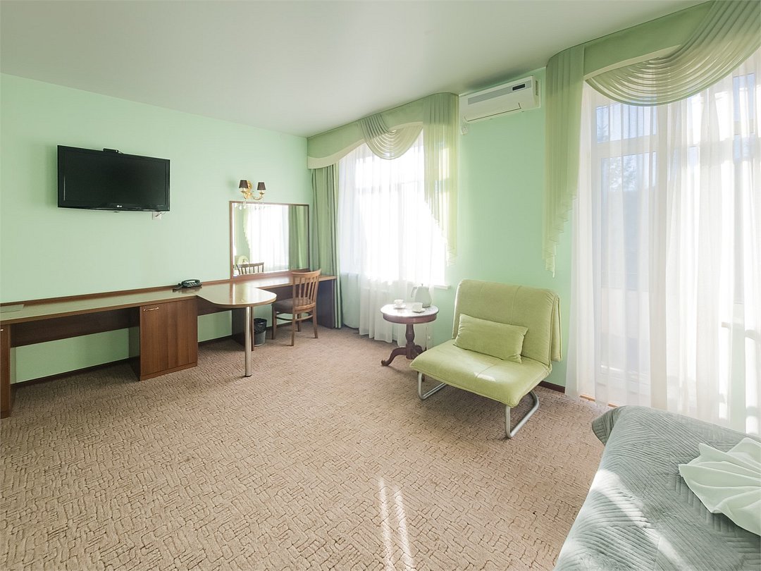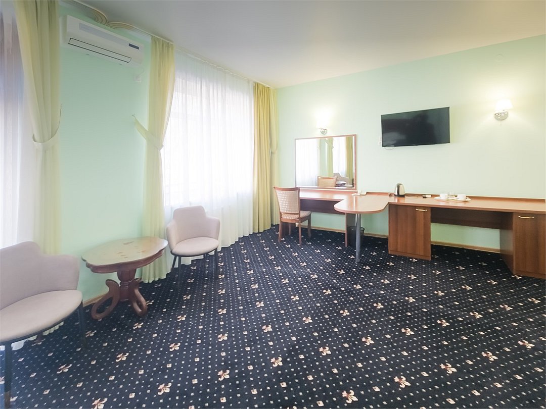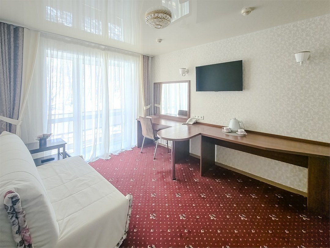 Комфортабельный просторный номер для двоих с раздельными зонами: спальней и гостиной. Комплектация: двуспальная кровать, диван, кресло, стулья, рабочая зона, журнальный столик, зеркало, комод, шкаф-купе, багажный столик. В номере есть все что нужно и для полноценного отдыха и для работы. Белоснежное постельное белье и полотенца, мягкие подушки и теплое одеяло, удобное рабочее пространство. Номер оснащен кондиционером, большим телевизором, набором посуды, холодильником и чайником. К вашим услугам беспроводной интернет и телефонная связь. В номере отдельный санузел большой площади, а также выход на открытый балкон. * На фото представлен один из номеров данной категории. Некоторые детали интерьера могут отличаться.Услуги и удобства