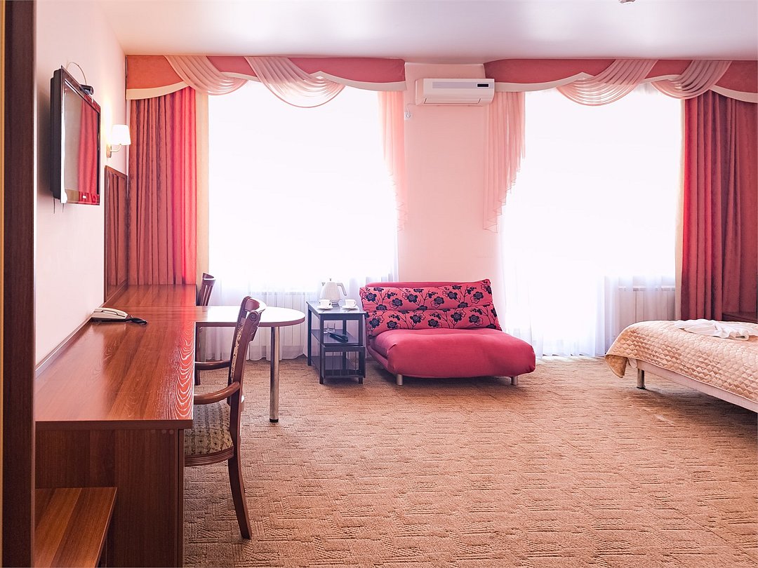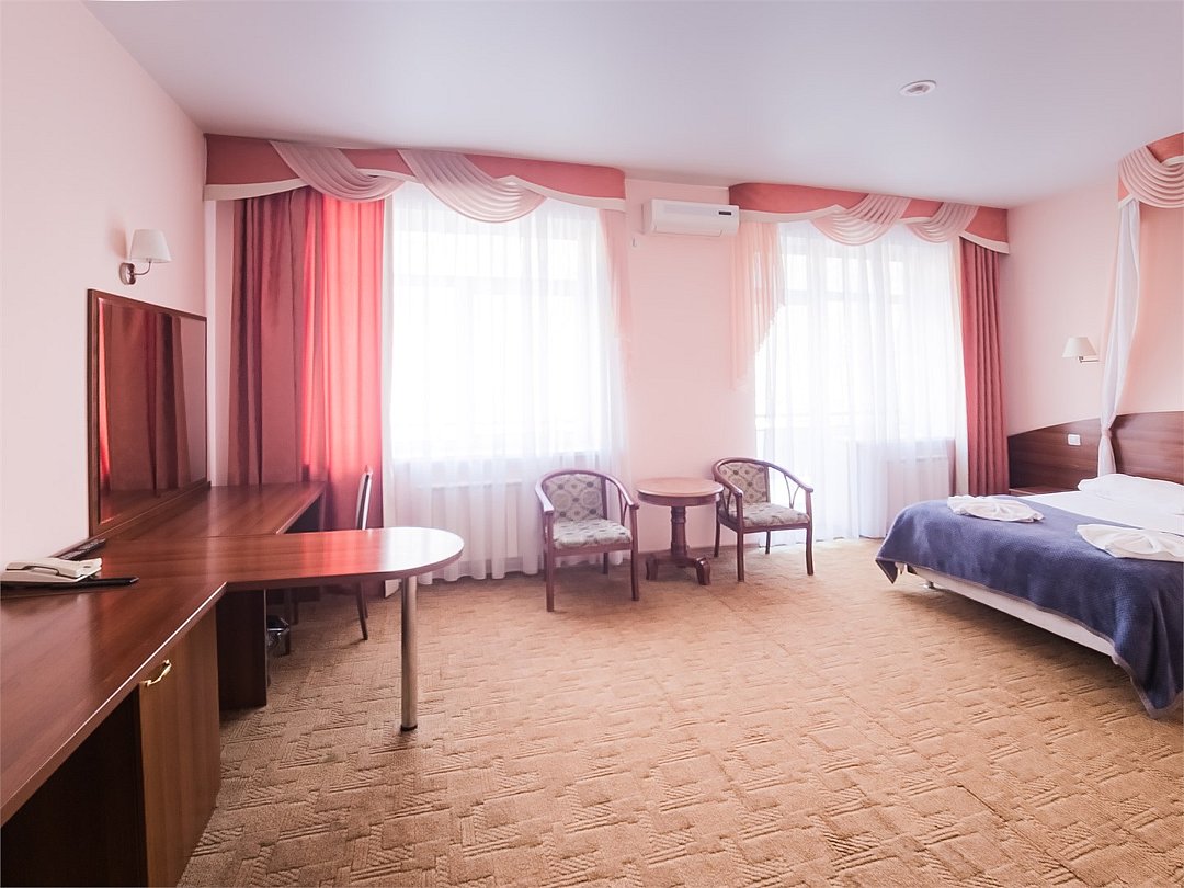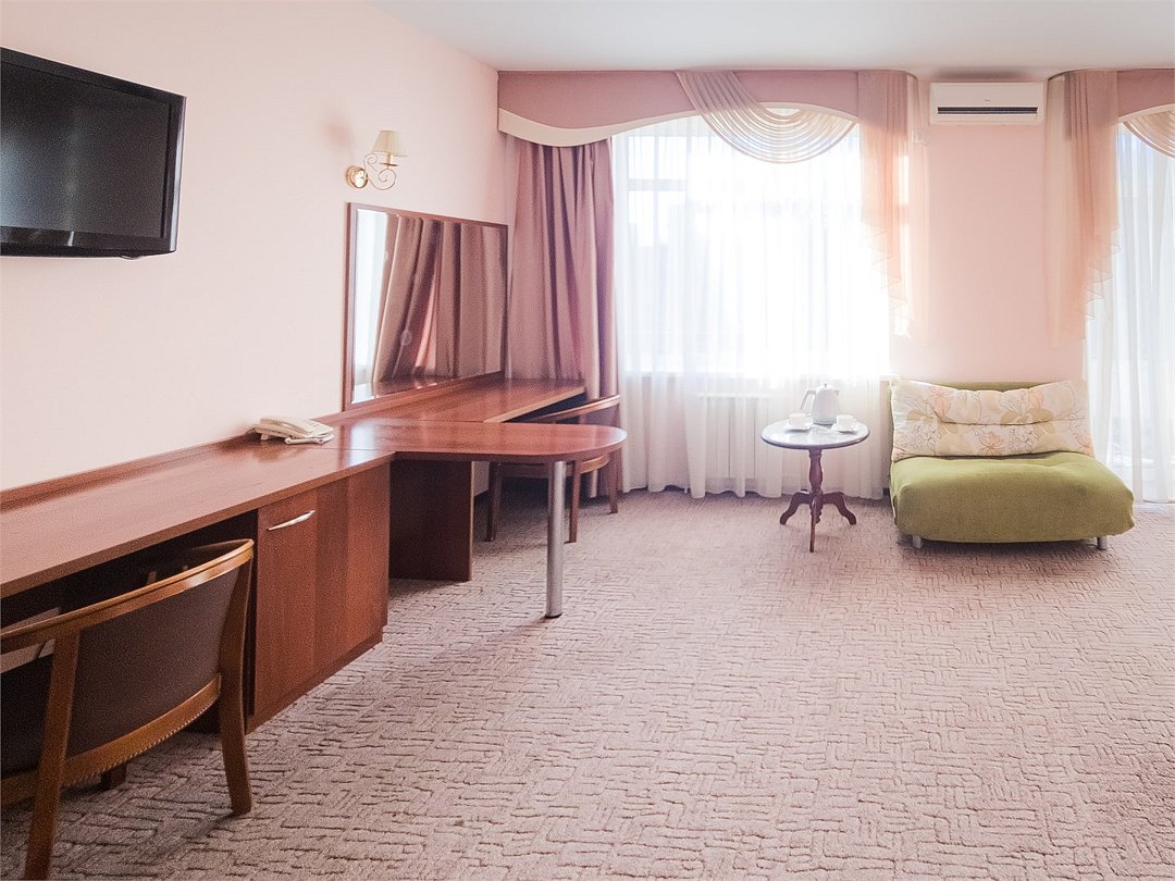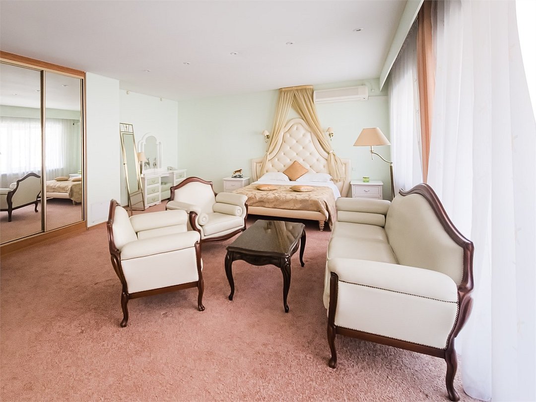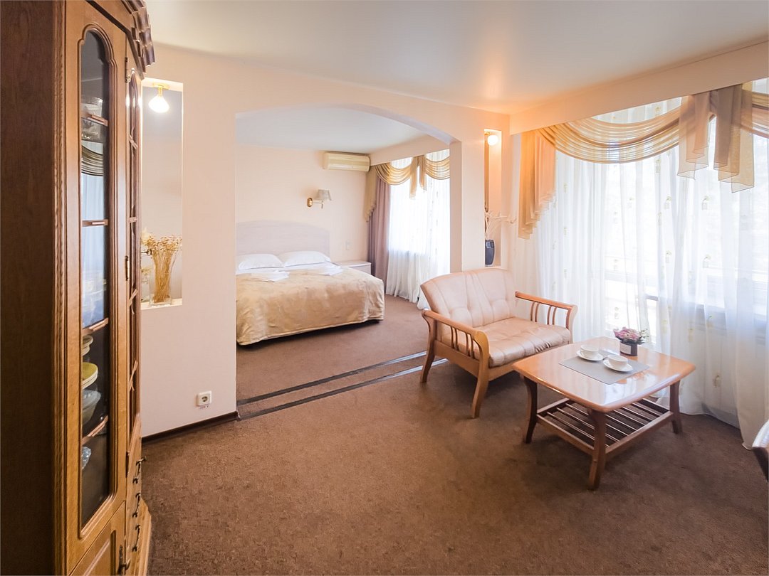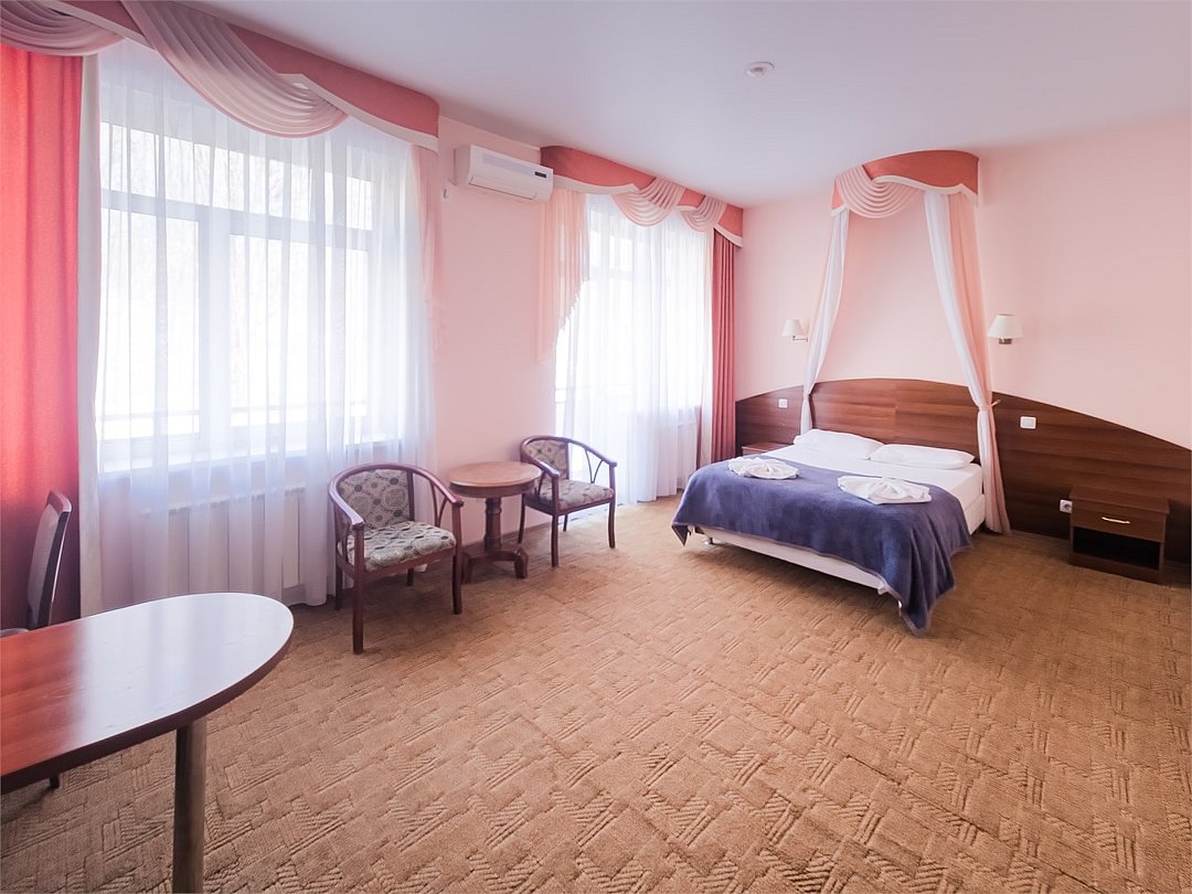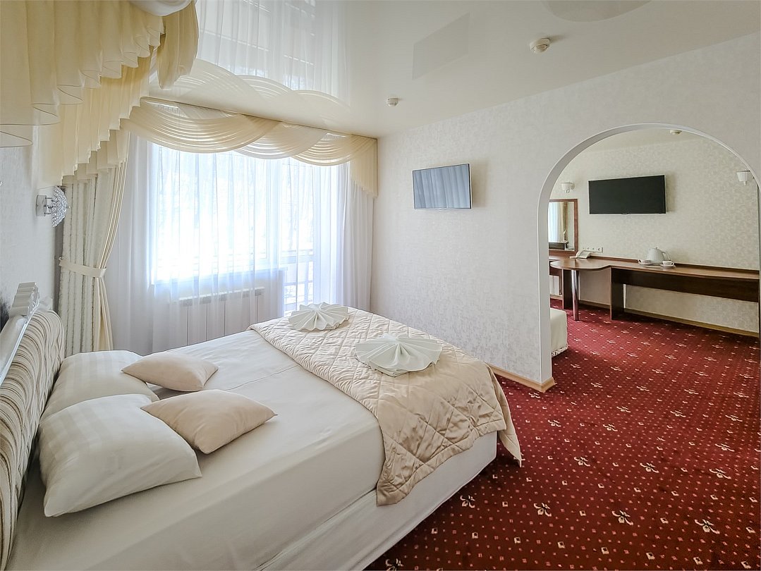 Комфортабельный просторный номер для двоих с раздельными зонами: спальней и гостиной. Комплектация: двуспальная кровать, диван, кресло, стулья, рабочая зона, журнальный столик, зеркало, комод, шкаф-купе, багажный столик. В номере есть все что нужно и для полноценного отдыха и для работы. Белоснежное постельное белье и полотенца, мягкие подушки и теплое одеяло, удобное рабочее пространство. Номер оснащен кондиционером, большим телевизором, набором посуды, холодильником и чайником. К вашим услугам беспроводной интернет и телефонная связь. В номере отдельный санузел большой площади, а также выход на открытый балкон. * На фото представлен один из номеров данной категории. Некоторые детали интерьера могут отличаться.Услуги и удобства