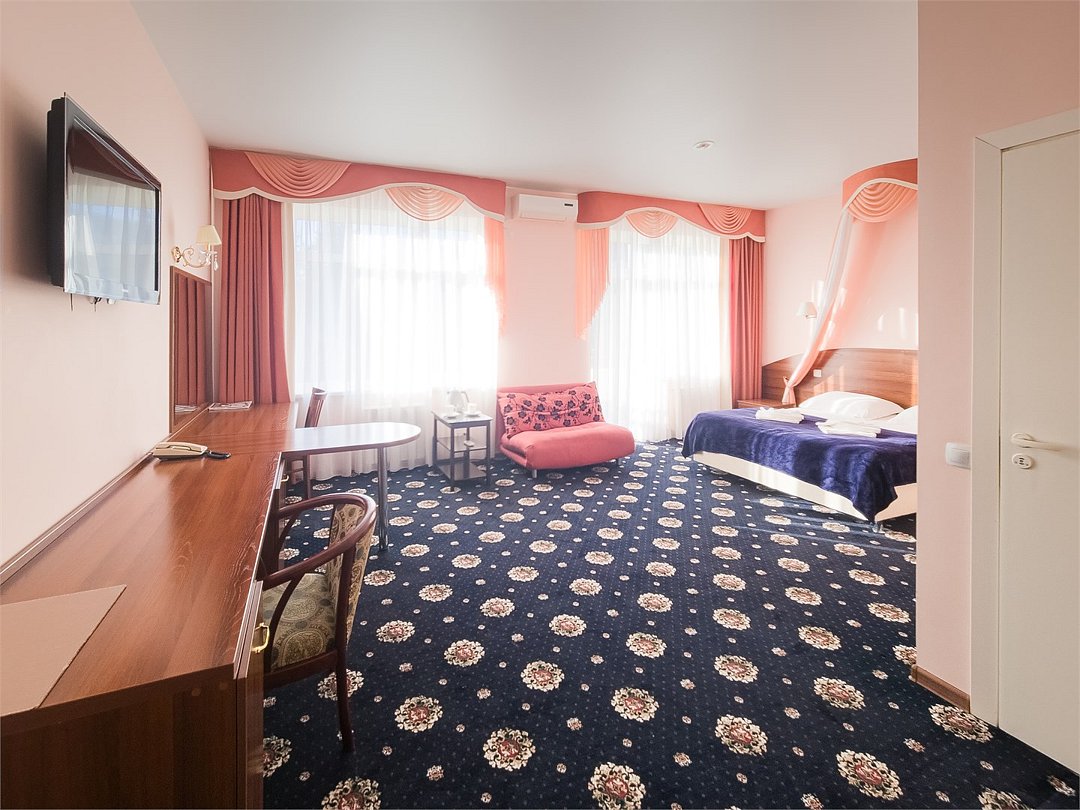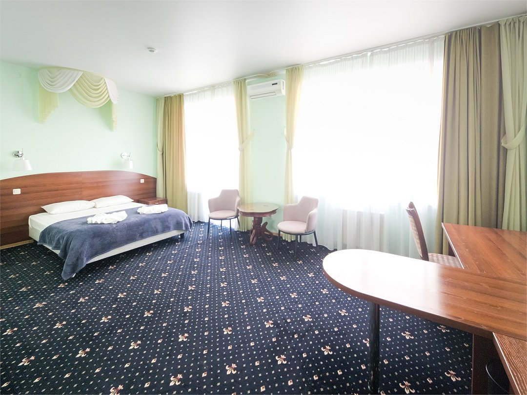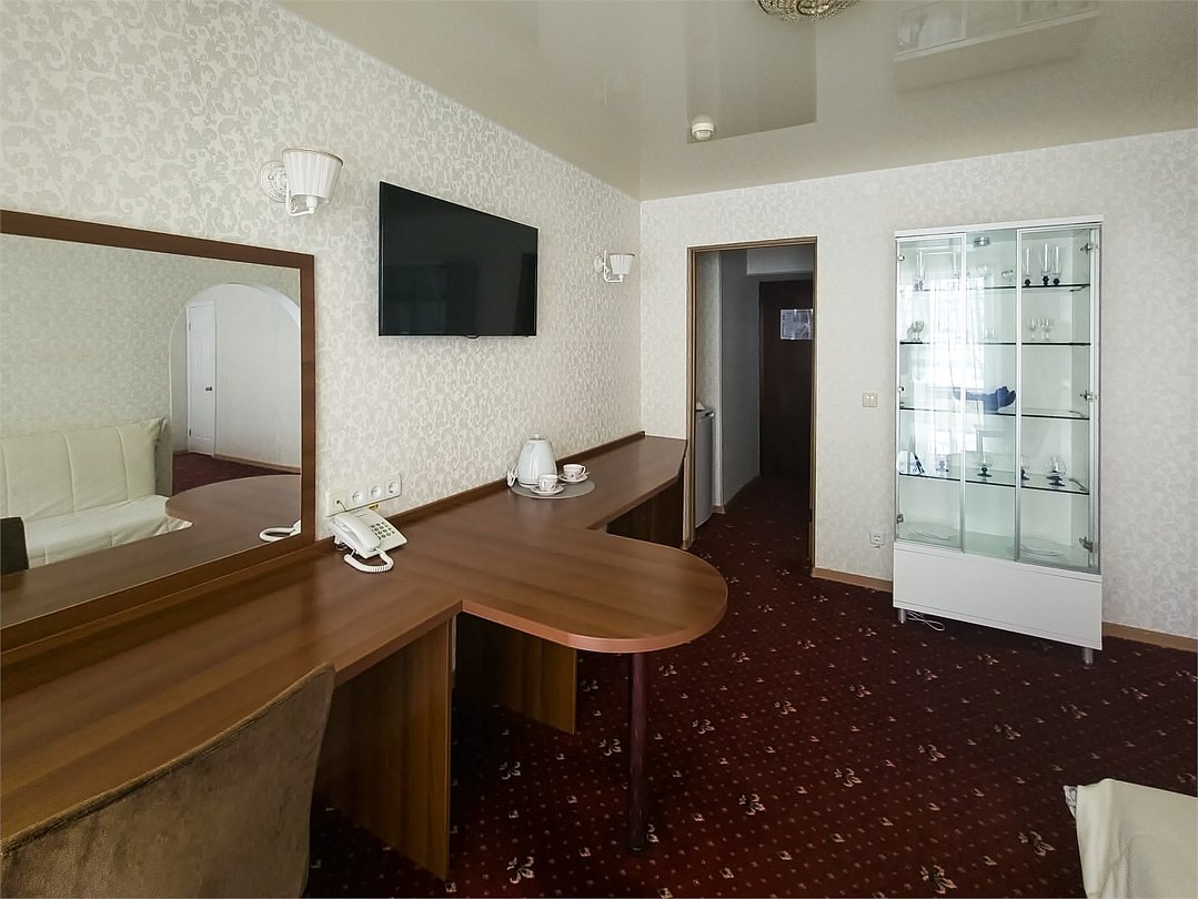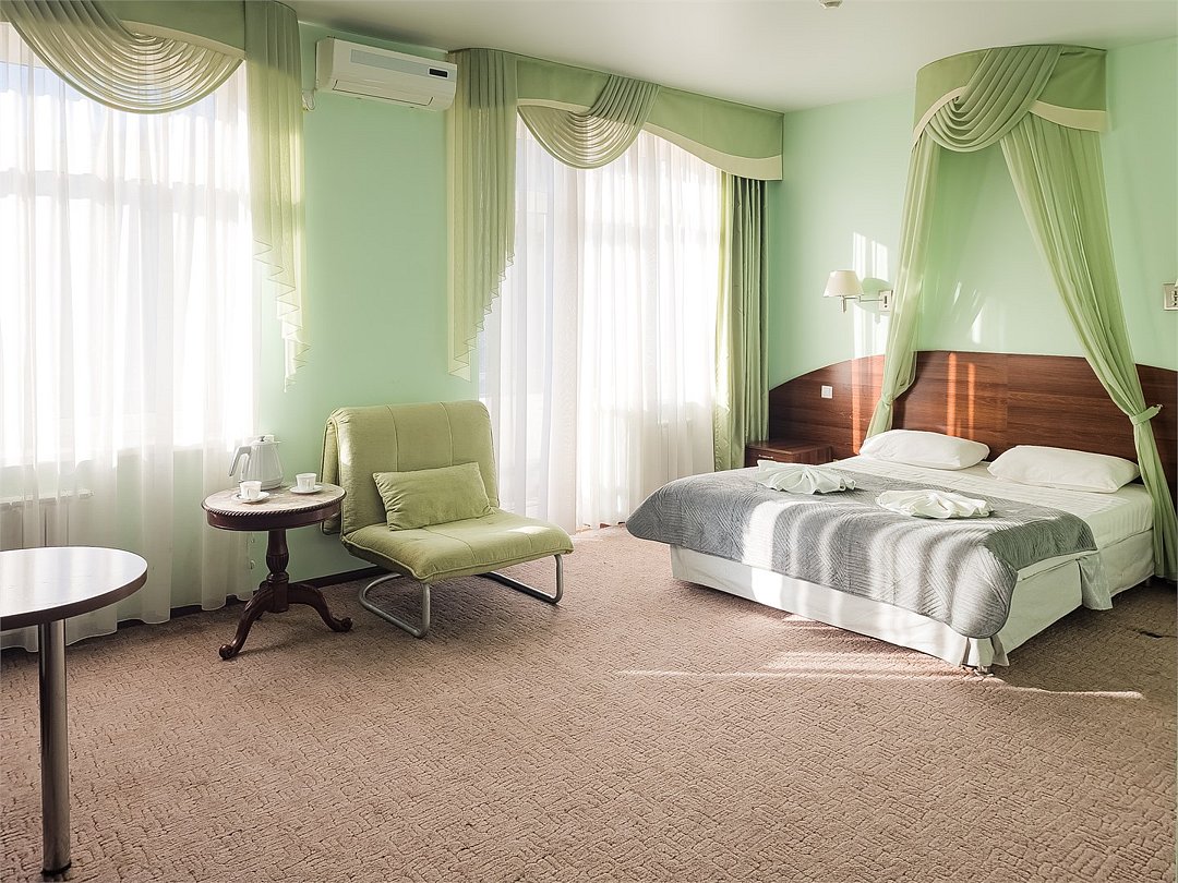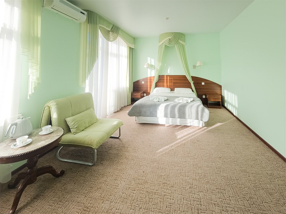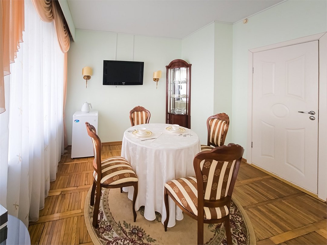 Комфортабельный просторный номер для двоих с раздельными зонами: спальней и гостиной. Комплектация: двуспальная кровать, диван, кресло, стулья, рабочая зона, журнальный столик, зеркало, комод, шкаф-купе, багажный столик. В номере есть все что нужно и для полноценного отдыха и для работы. Белоснежное постельное белье и полотенца, мягкие подушки и теплое одеяло, удобное рабочее пространство. Номер оснащен кондиционером, большим телевизором, набором посуды, холодильником и чайником. К вашим услугам беспроводной интернет и телефонная связь. В номере отдельный санузел большой площади, а также выход на открытый балкон. * На фото представлен один из номеров данной категории. Некоторые детали интерьера могут отличаться.Услуги и удобства