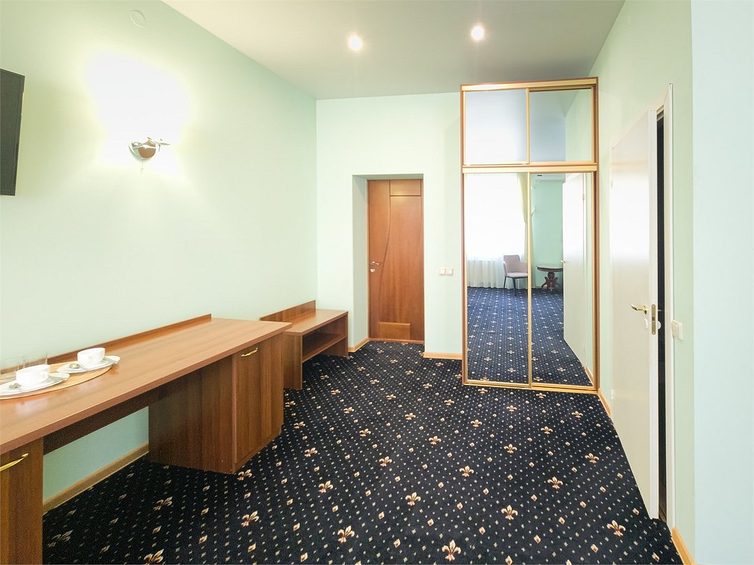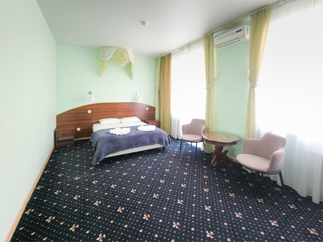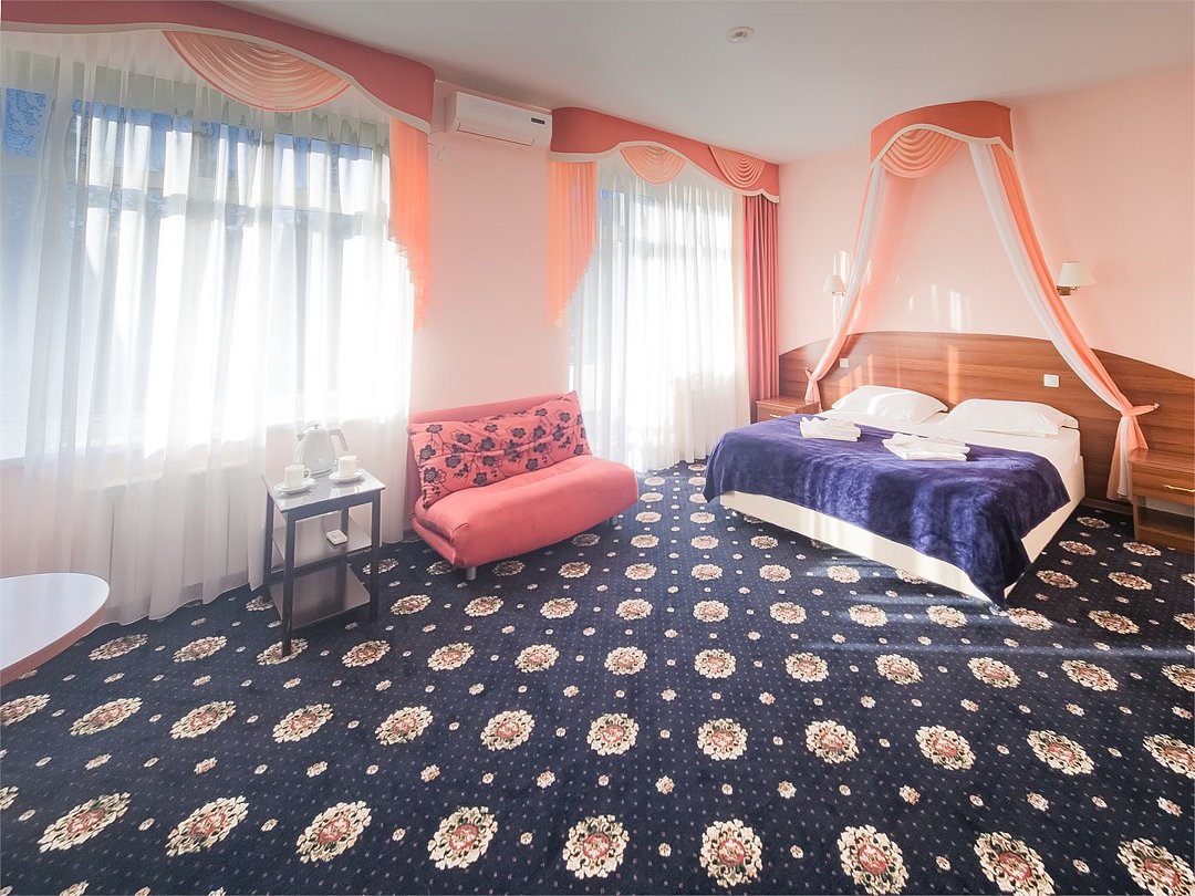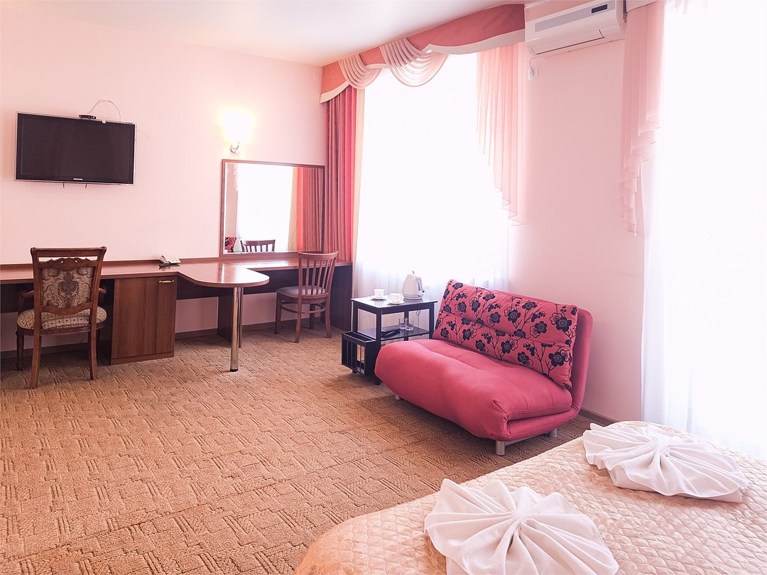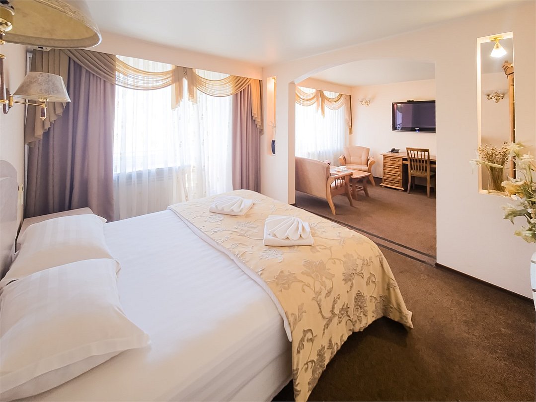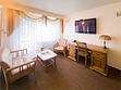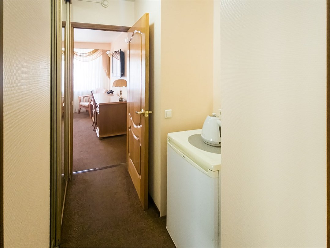 Комфортабельный просторный номер для двоих с раздельными зонами: спальней и гостиной. Комплектация: двуспальная кровать, диван, кресло, стулья, рабочая зона, журнальный столик, зеркало, комод, шкаф-купе, багажный столик. В номере есть все что нужно и для полноценного отдыха и для работы. Белоснежное постельное белье и полотенца, мягкие подушки и теплое одеяло, удобное рабочее пространство. Номер оснащен кондиционером, большим телевизором, набором посуды, холодильником и чайником. К вашим услугам беспроводной интернет и телефонная связь. В номере отдельный санузел большой площади, а также выход на открытый балкон. * На фото представлен один из номеров данной категории. Некоторые детали интерьера могут отличаться.Услуги и удобства