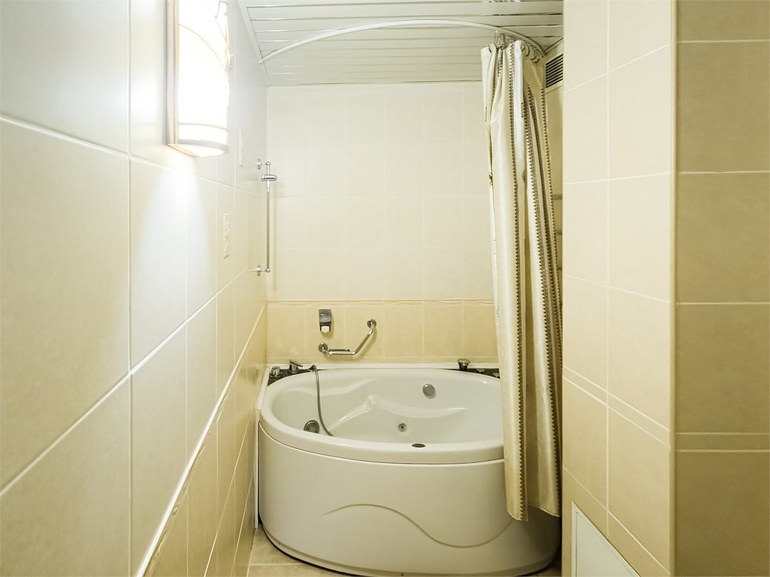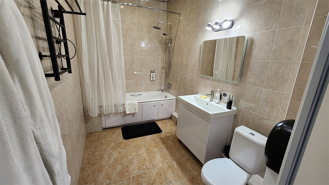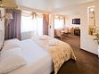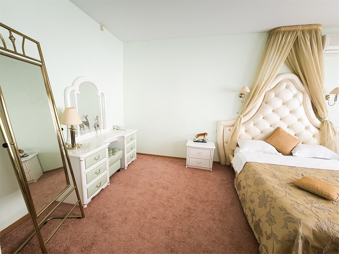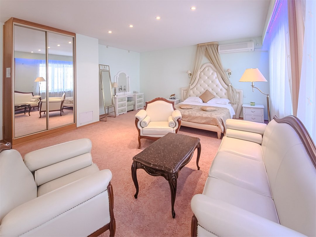 Самый лучший номер в отеле. Просторная студия открытого типа, зрительно разделённая на залы: спальня, обеденная зона, гостиная. Комплектация: кровать queen size, зона с диваном и креслами, обеденный стол, стулья, комод, журнальный стол, прикроватные тумбы, туалетный столик, зеркало напольное, багажная полка, шкаф купе, телефон, телевизор, холодильник, чайник, посуда, кондиционер, , халаты, тапочки, гигиенические и туалетные принадлежности, чай, кофе, посуда. Белоснежное постельное белье и полотенца, мягкие подушки и теплое одеяло. Номер данной категории оснащен кондиционером, телевизором, телефоном, холодильником, чайником. Имеется просторный санузел с ванной и душевой кабиной, биде ,фен. Есть выход на собственный открытый балкон. К вашим услугам кулер с горячей и холодной водой на этаже, гладильные принадлежности, прачечная.Услуги и удобства