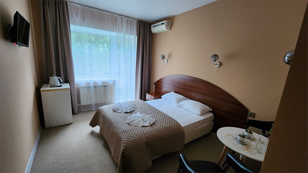 Бюджетный номер для двоих с двуспальной кроватью. В нем есть все необходимое для полноценного отдыха. Номер оснащен кондиционером, телевизором, холодильником и чайником. К вашим услугам беспроводной интернет и телефонная связь. В номере отдельный санузел с небольшой ванной, а также выход на открытый балкон. * На фото представлен один из номеров данной категории. Некоторые детали интерьера могут отличаться.Услуги и удобства