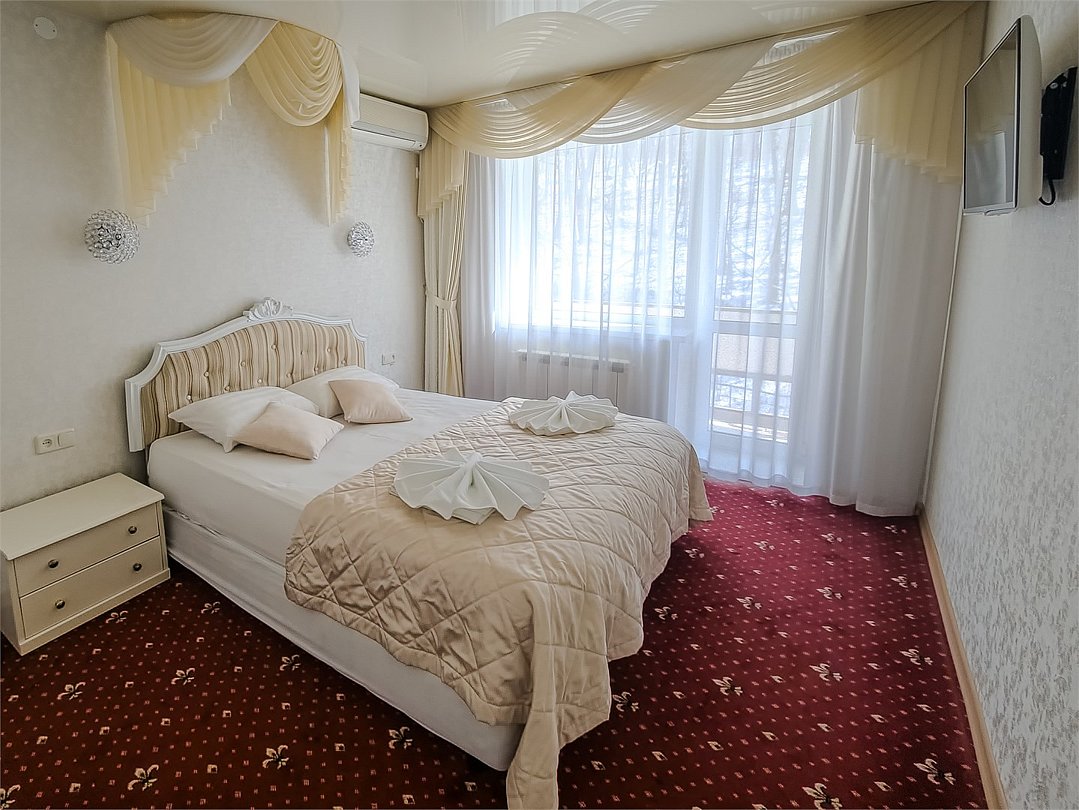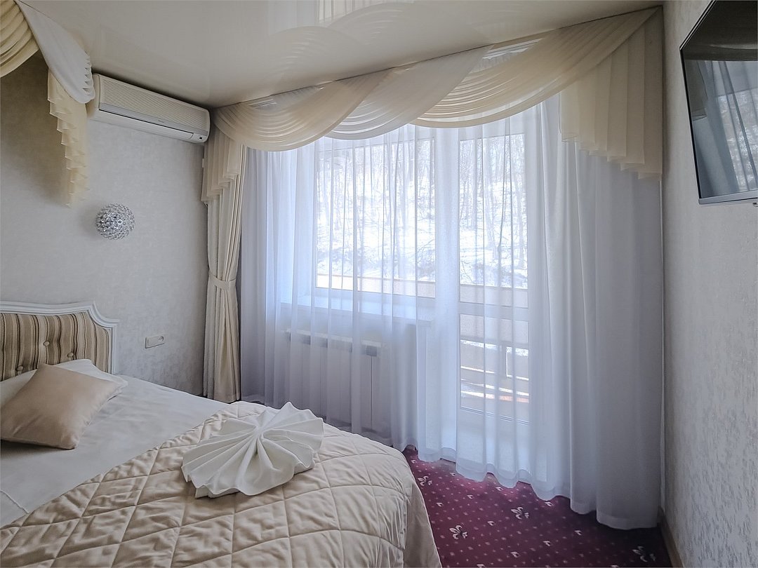 Комфортабельный просторный номер для двоих, отличающийся большей площадью жилой и ванной комнат. В нем есть все что нужно и для полноценного отдыха и для работы. Белоснежное постельное белье и полотенца, мягкие подушки и теплое одеяло, удобное рабочее пространство. Номер оснащен кондиционером, большим телевизором, холодильником и чайником. К вашим услугам беспроводной интернет и телефонная связь. В номере отдельный санузел большой площади, а также выход на открытый балкон. * На фото представлен один из номеров данной категории. Некоторые детали интерьера могут отличаться.Услуги и удобства