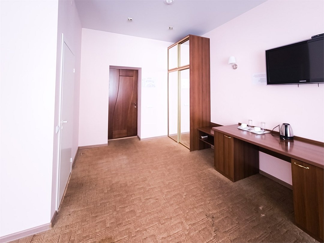 Комфортабельный просторный номер для двоих, отличающийся большей площадью жилой и ванной комнат. В номере только закончен ремонт, современный интерьер. В нем есть все что нужно и для полноценного отдыха и для работы. Белоснежное постельное белье и полотенца, мягкие подушки и теплое одеяло, удобное рабочее пространство. Номер оснащен кондиционером, большим телевизором, холодильником и чайником. К вашим услугам беспроводной интернет и телефонная связь. В номере отдельный санузел большой площади, а также выход на открытый балкон. * На фото представлен один из номеров данной категории. Некоторые детали интерьера могут отличаться.Услуги и удобства