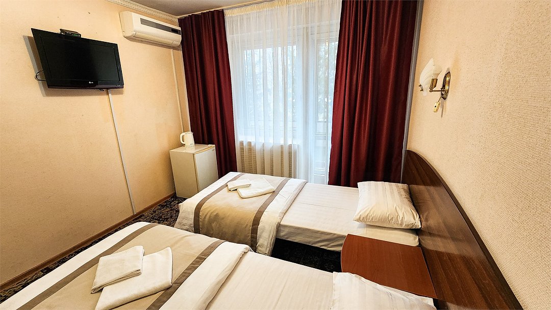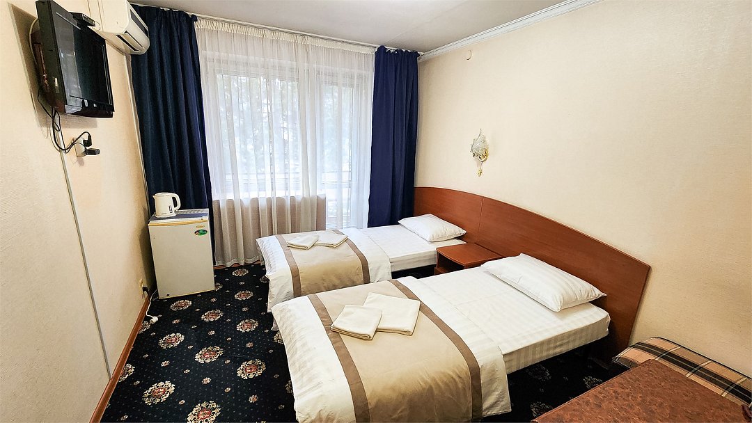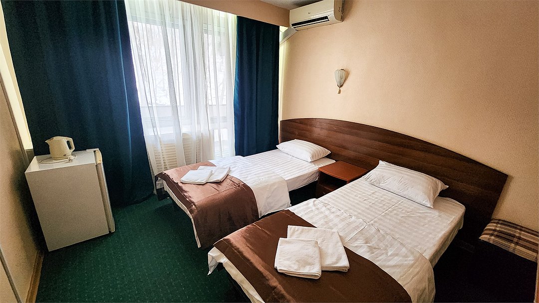 Комфортный номер для двоих с двумя односпальными кроватями. В нем есть все необходимое для полноценного отдыха. Белоснежное постельное белье и полотенца, мягкие подушки и теплые одеяла. Номер оснащен кондиционером, телевизором, холодильником и чайником. К вашим услугам беспроводной интернет и телефонная связь. В номере отдельный санузел с небольшой ванной, а также выход на открытый балкон. * На фото представлен один из номеров данной категории. Некоторые детали интерьера могут отличаться.Услуги и удобства
