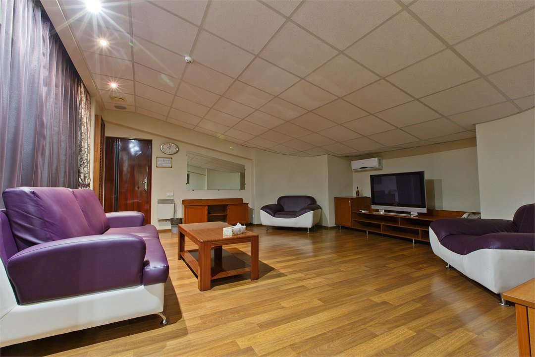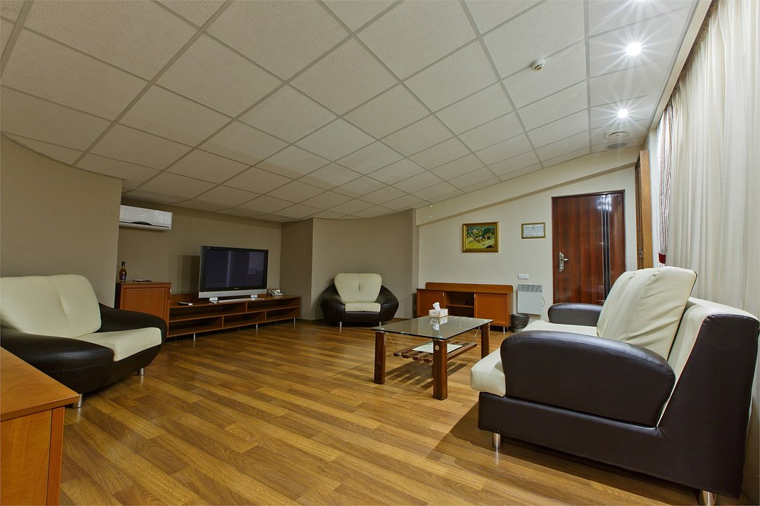 два телевизора, Wi-Fi, холодильник, кондиционер, светильник, настольные лампы, фен, обогреватель, ванна или душевая кабина, ванная с джакузи, санузел, банные принадлежности, халаты, банные полотенца, тапочки, гигиенические средства, кровать «King size», диван, кресла, шкаф для одежды, вешалки, багажная тумба, зеркало, две комнаты, чайный набор, набор посуды, информационная карта, меню, унитаз, раковина, питьевая вода, гостиная зона, отопление, душ, вид на город, стаканы, столовые приборы, кофейный столик, стол, тумба, туалетные средства, туалет, внутренний телефон, шкаф-купе, номер для некурящих, антибактериальное средство для рук, без питомцевВ номере
