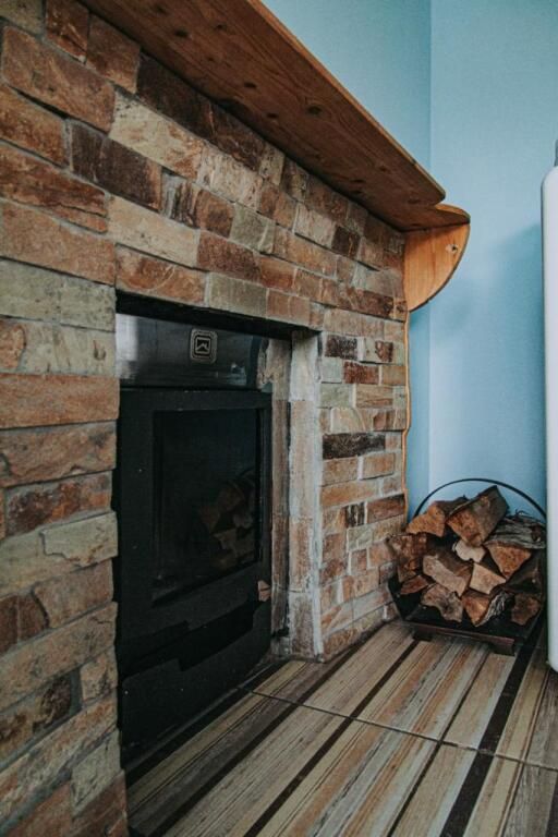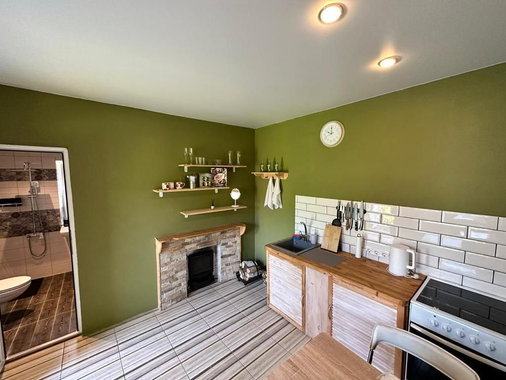 Полностью оборудованная кухня с камином. К вашим услугам холодильник, плита, микроволновая печь, полный набор посуды и даже настольные игры для приятного времяпрепровождения.