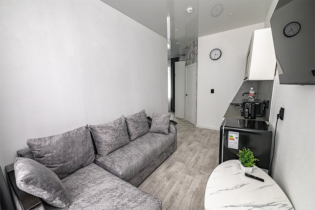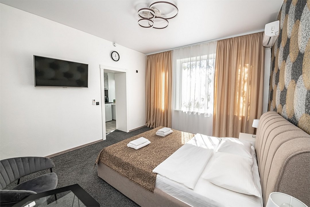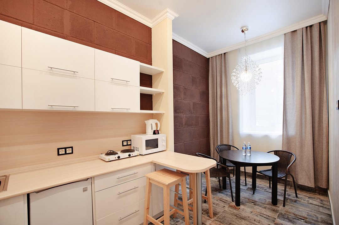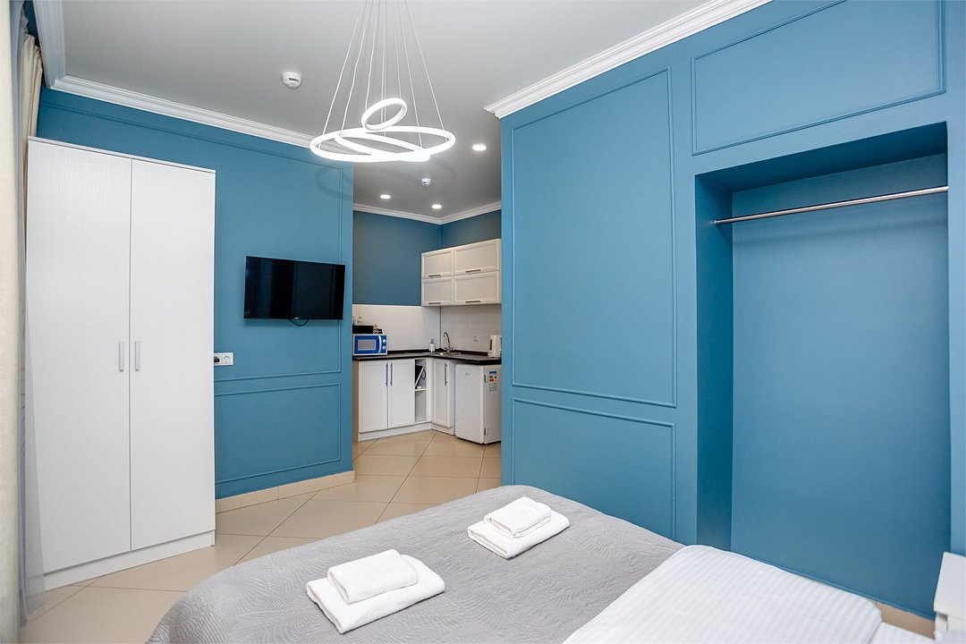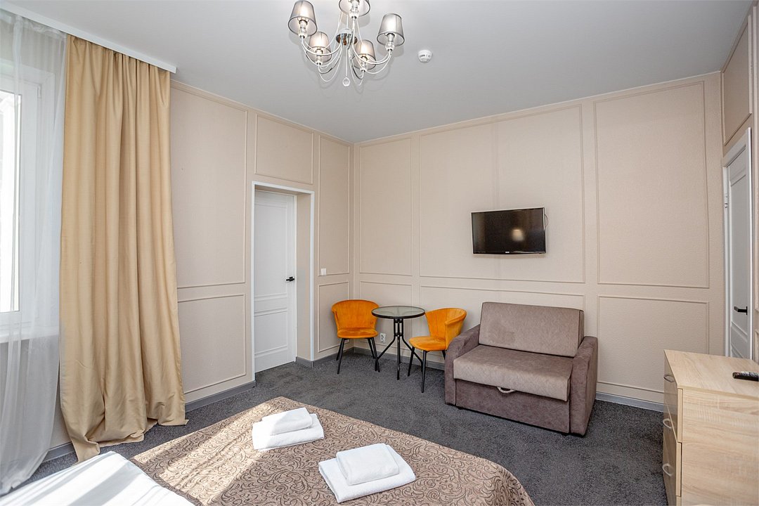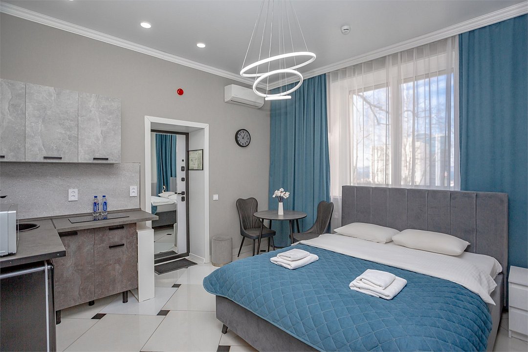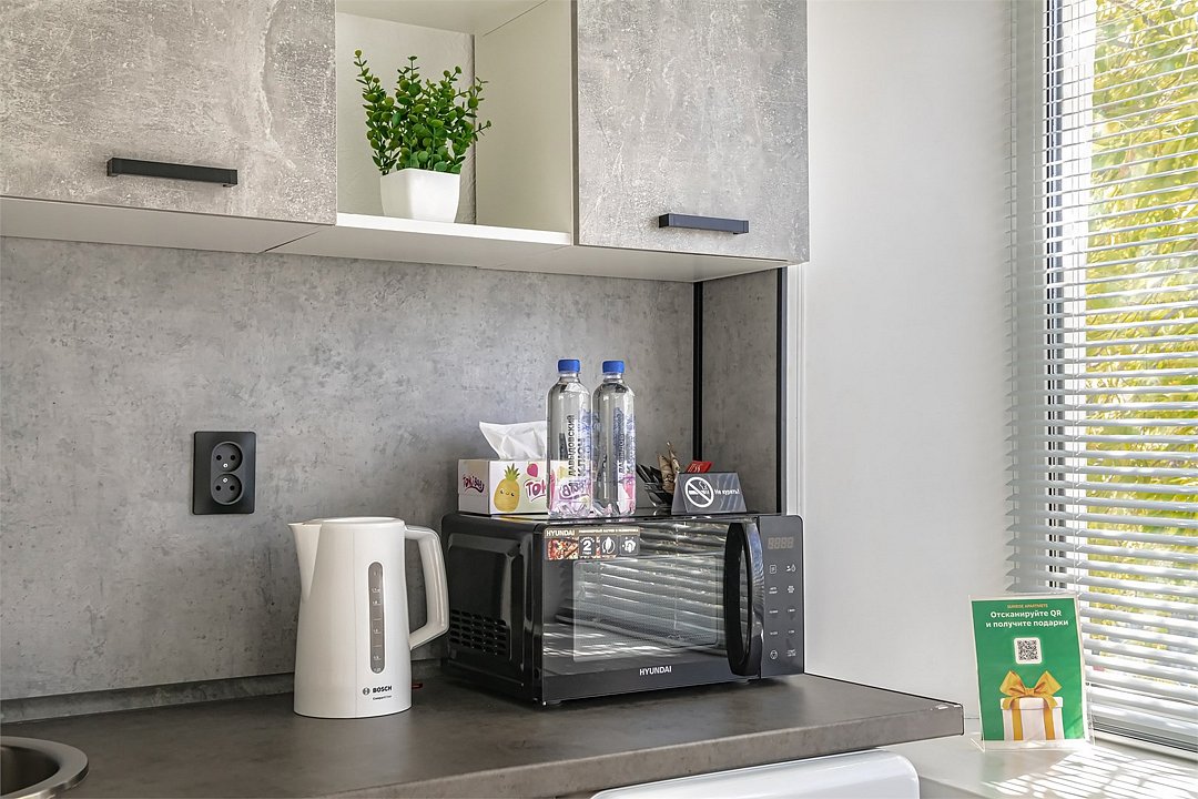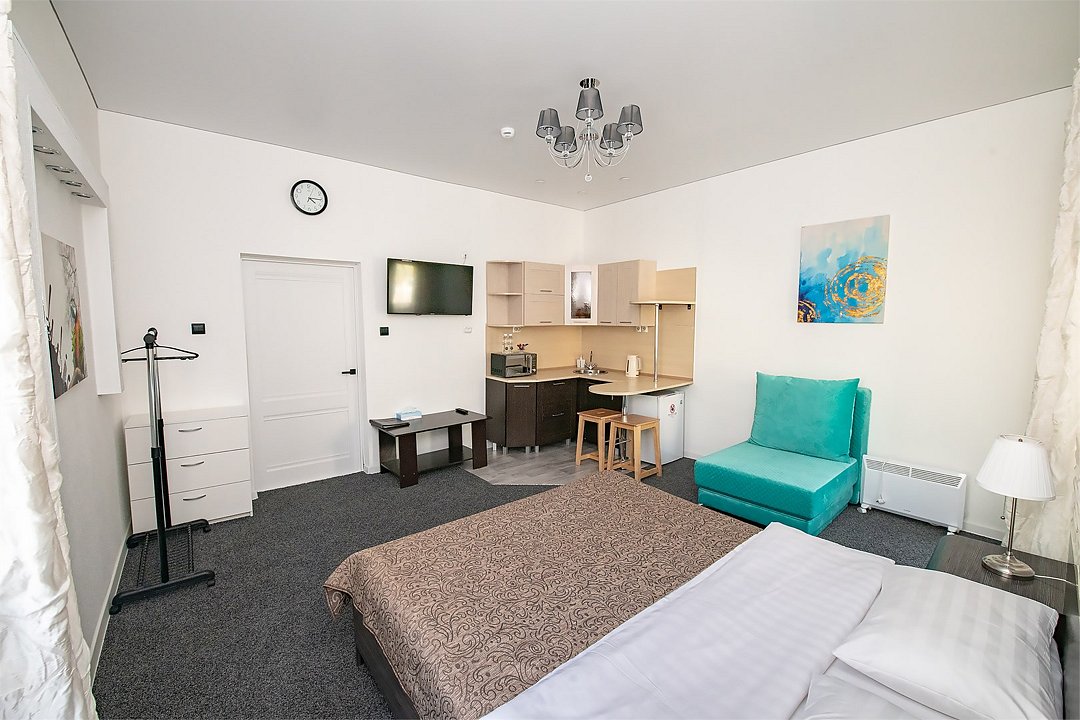 Максимальное размещение: 2+1. Комфортабельные однокомнатные номера категории «Улучшенный» отличаются большей площадью, наличием дополнительного спального места (раздвижной диван), а также отдельной кухонной зоной. Номер сочетает в себе все необходимое для полноценного отдыха, как семейным парам с детьми, так и для друзей небольшой компанией. Обратите, пожалуйста, внимание, что определенный дизайн номера забронировать невозможно, вы можете указать в комментариях к бронированию или администратору, какой номер хотите, и наш администратор учтет это при наличии данного свободного номера.Услуги и удобства