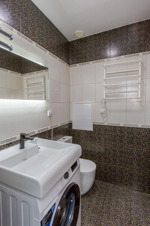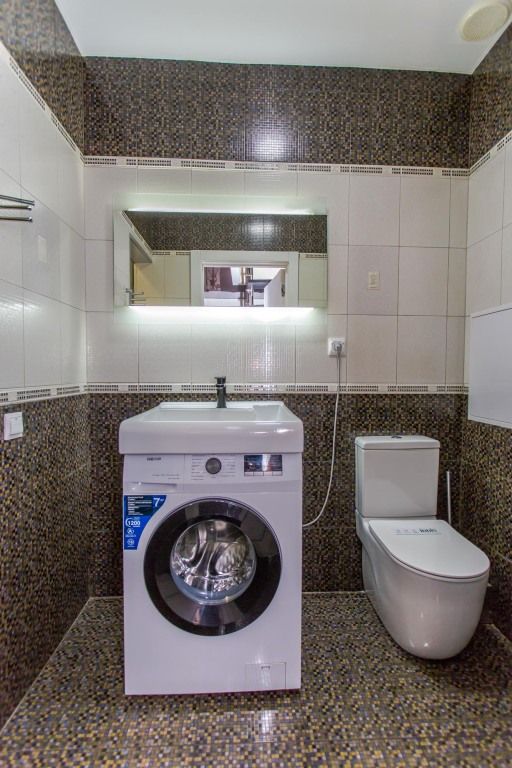 В ванной комнате — стиральная машина и индивидуальные наборы одноразовых зубных щеток и пасты для каждого гостя.
