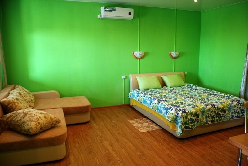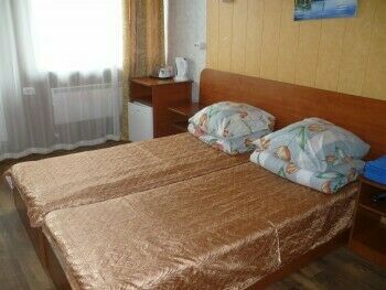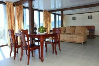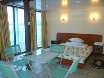 Оснащение: Номер состоит из 2-х комнат. 4-х местный номер со всеми удобствами и террасой с видом на море. 2-х спальная кровать, диван, телевизор, холодильник, кондиционер, м/в печь, чайник, стол, стулья, туалет, душ, умывальник (вода горячая, холодная).