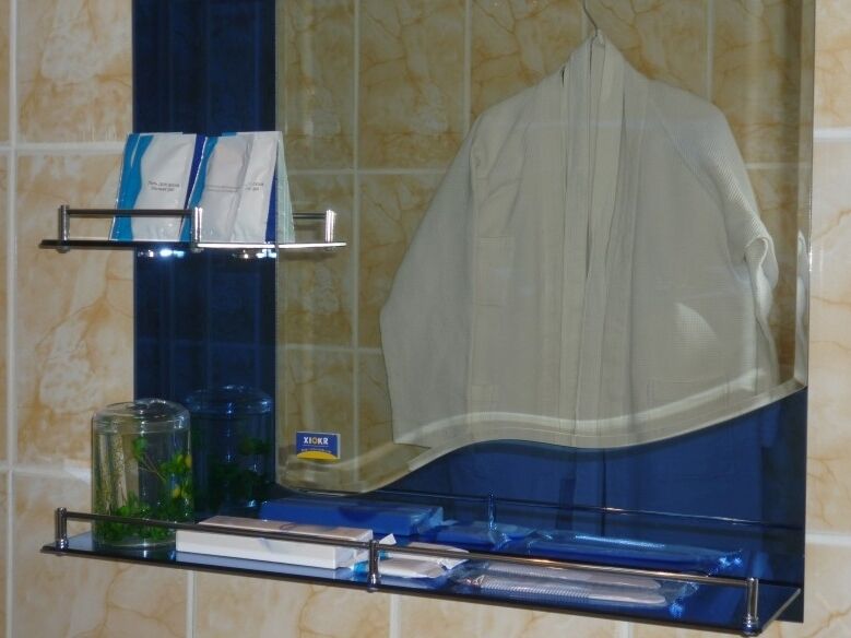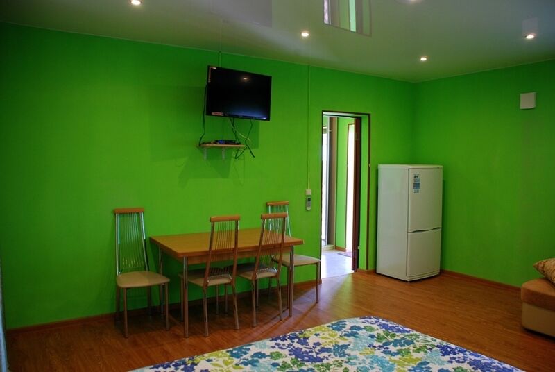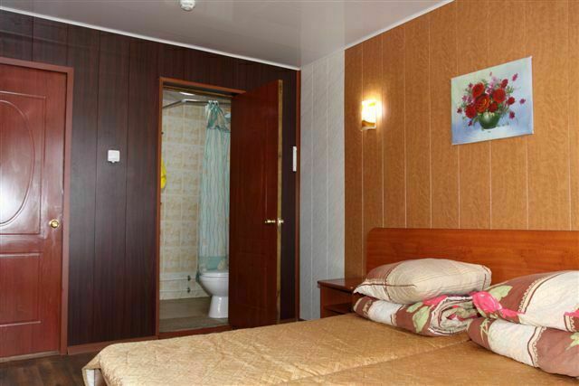 В номере: двуспальная кровать, стол, телевизор, холодильник, чайник, шкаф-купе, кухонный шкаф; туалет, душевая кабина, умывальник (вода горячая, холодная).