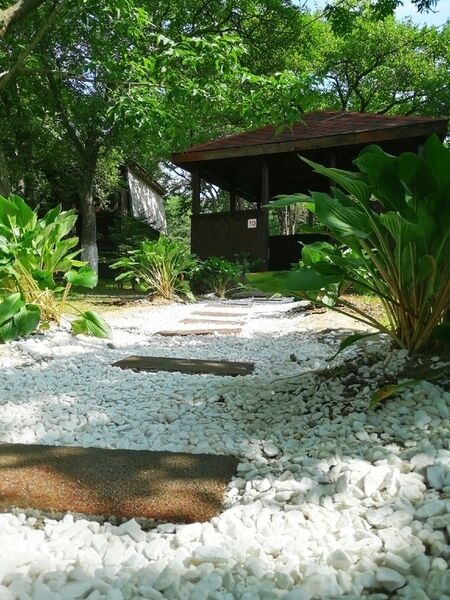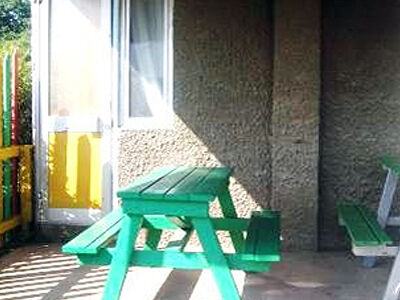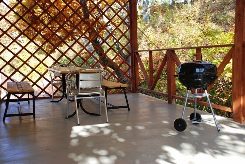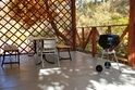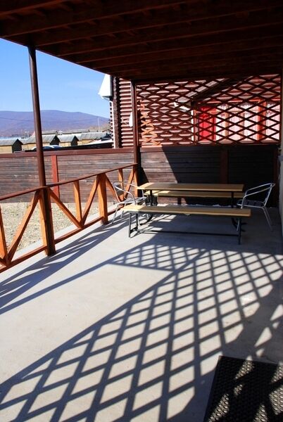 Перед входом в номер имеется небольшая зона отдыха под навесом, оборудованная столом и лавочками.