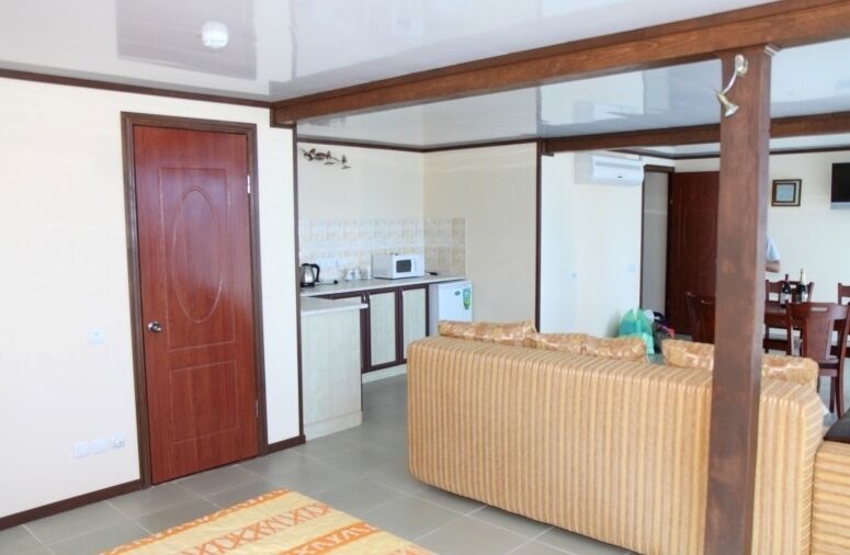 В номере: мягкая мебель, обеденный стол, кухонная зона, кондиционер, холодильник, телевизор, шкаф-купе, м/в печь, чайник, двух спальная кровать, тумбочка; туалет, душ, умывальник (вода горячая, холодная); веранда с видом на море, большая терраса под навесом.