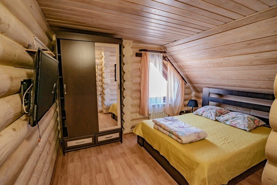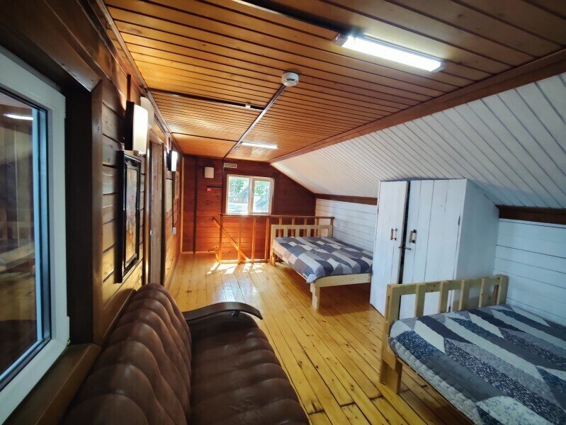 36 кв.м., 1 этаж:2-спальная кровать, холодильник, чайник, ТВ, кондиционер, с/у с душем. 2 этаж: две 1-спальные кровати