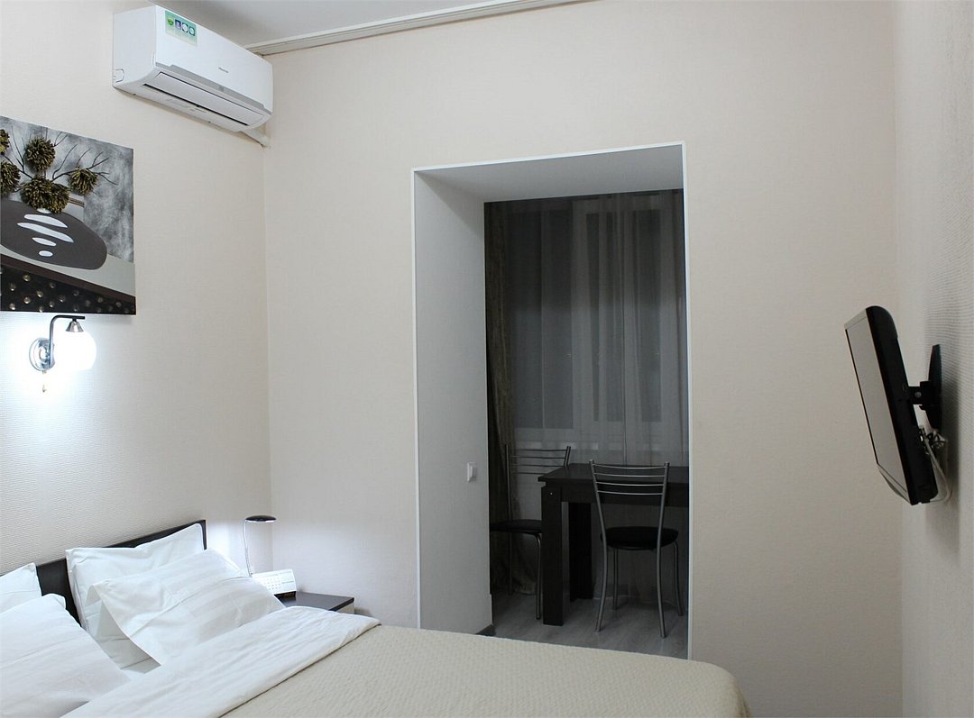 телевизор, холодильник, кондиционер, фен, микроволновая печь, утюг, ванна, водонагреватель, теплый пол, банные принадлежности, двуспальная кровать, стулья, вешалки, обеденный стол, зеркало, унитаз, раковина, тумба, туалетВ гостиничном номере
