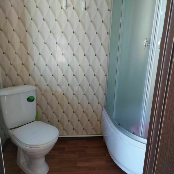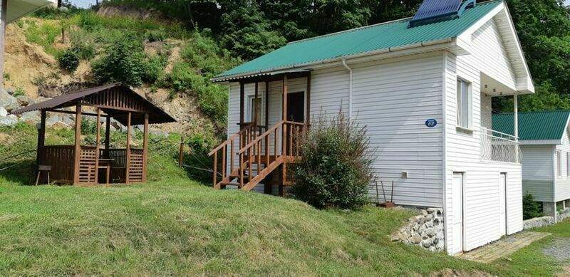 В домике две отдельные спальни: в первой двуспальная кровать, комод, телевизор; во второй две односпальные кровати, комод, телевизор. Кухня: раскладной диванчик, кухонный гарнитур, холодильник, обеденная зона, вся необходимая посуда, чайник. Санузел: унитаз, душевая кабинка (холодная и горячая вода)