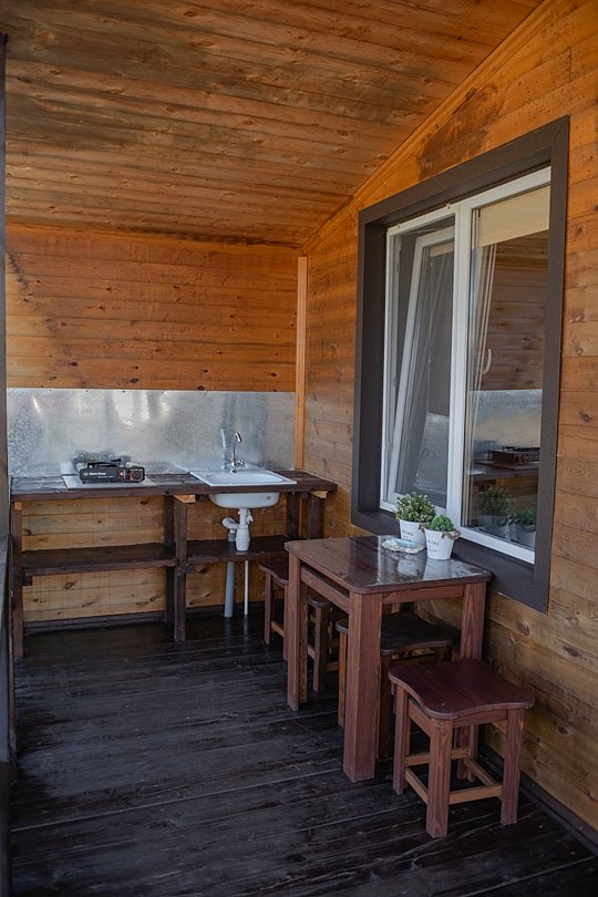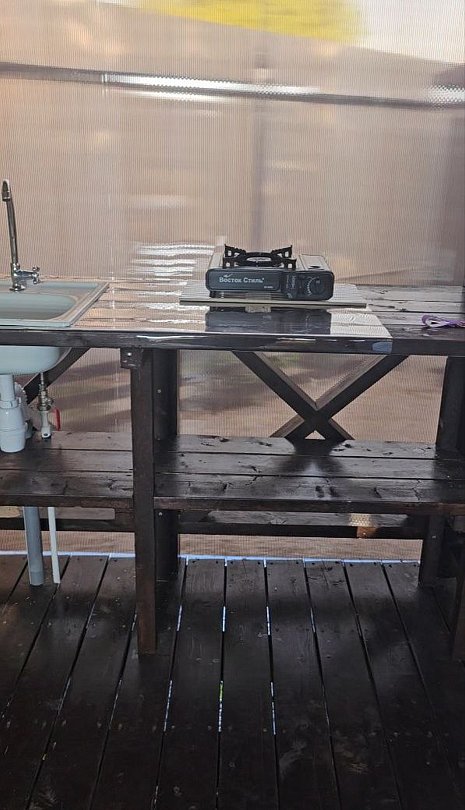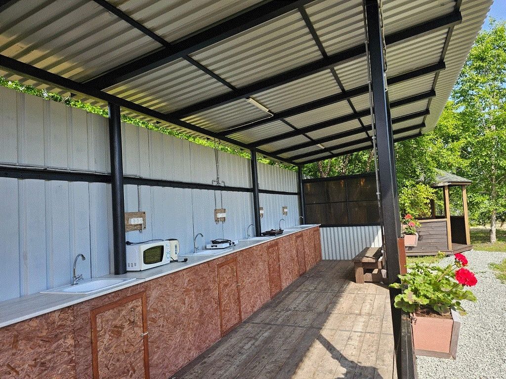 Для общего пользования доступны две летние кухни, оборудованные раковинами, микроволновыми печами, электрочайниками и газовыми плитами. Газовые баллоны гости предусматривают самостоятельно, приобретаются в магазинах, расположенных в шаговой доступности.
