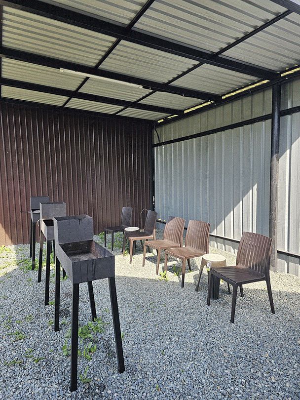 Имеются стульчики. Шампуры, решётки, уголь, дрова, розжиг и пр. гости предусматривают самостоятельно (в шаговой доступности есть магазины, где можно приобрести данные товары).