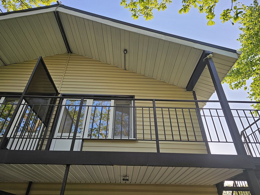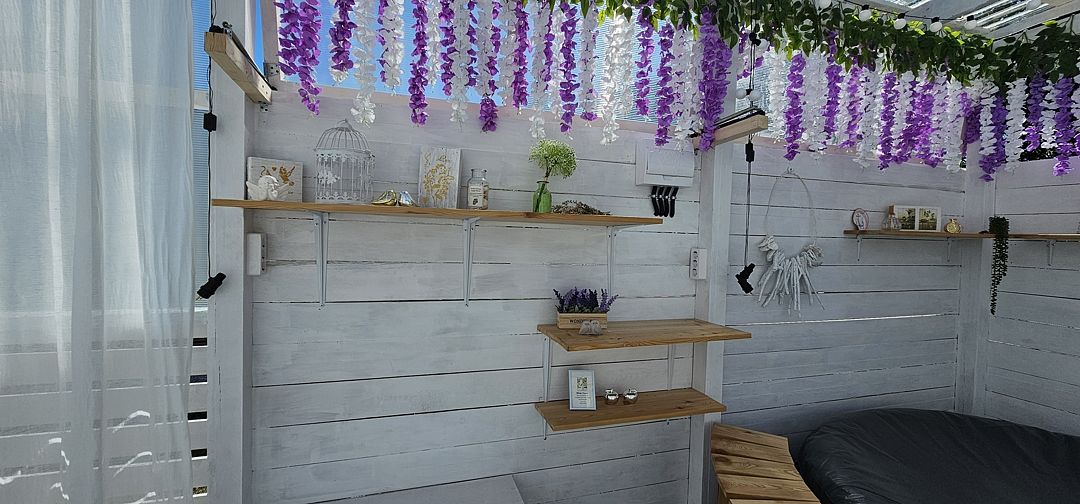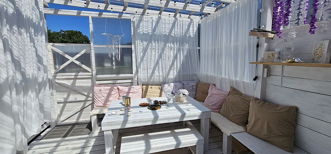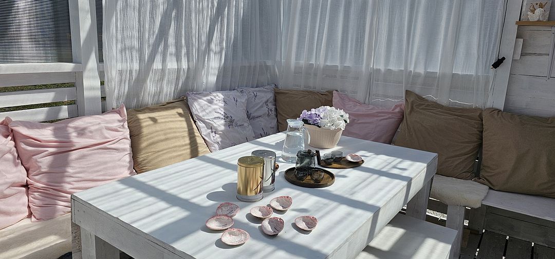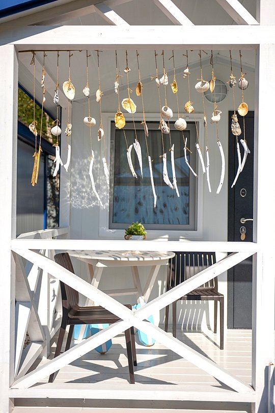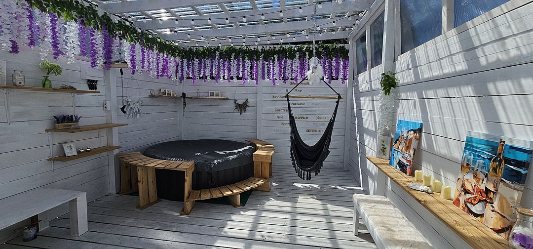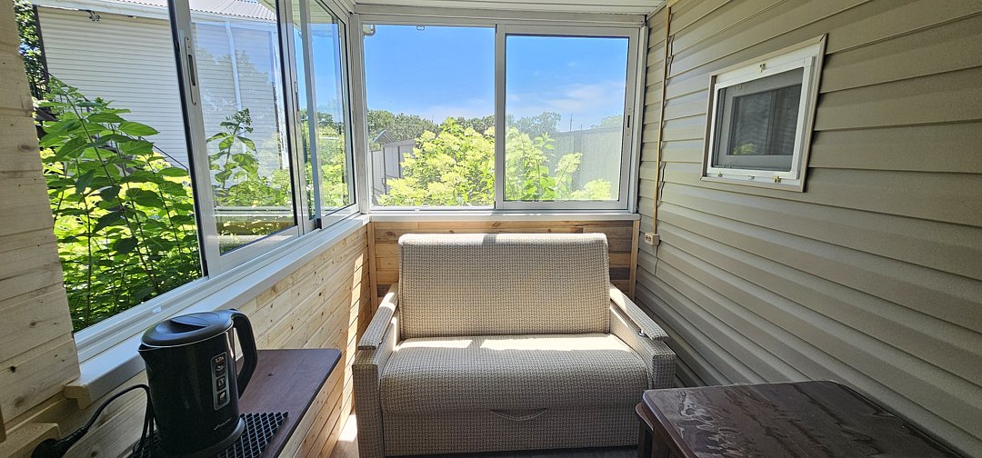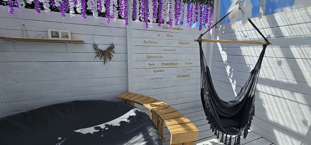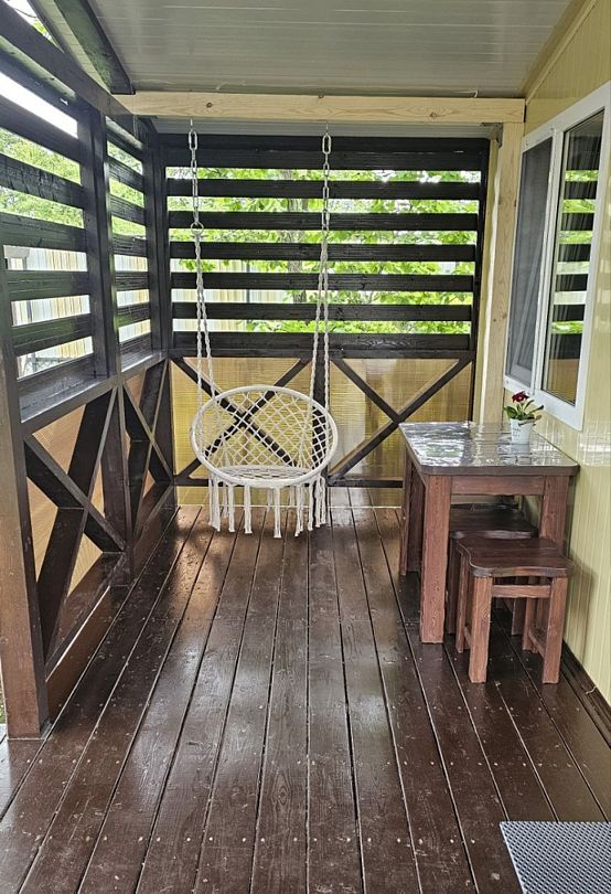 Телевизор, кресло-качель на веранде, увеличенная веранда.