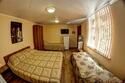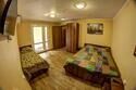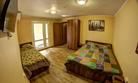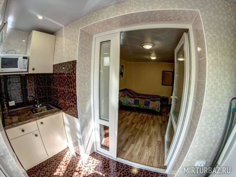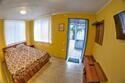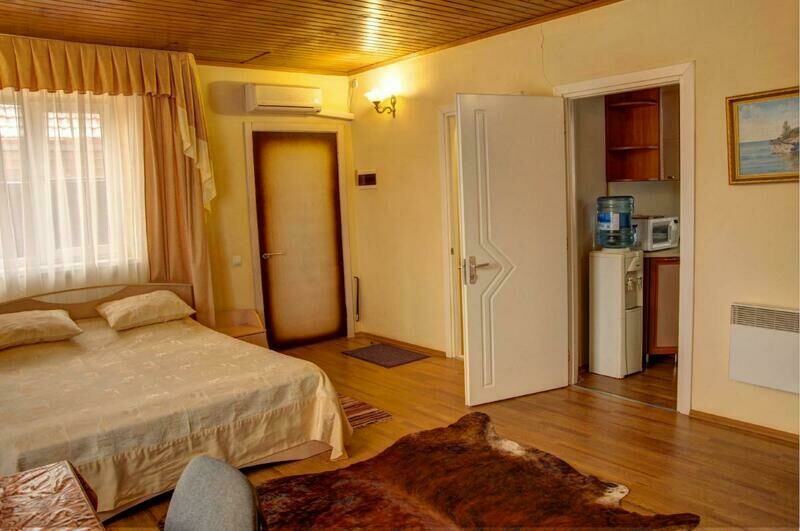 Номер на первом этаже, уютный дворик, Две комнаты, в первой: одна двухспальная кровать и одна односпальная, во второй: одна двухспальная кровать и две односпальных, в каждой комнате телевизор. Небольшая кухня: холодильник, микроволновая печь. Все удобства
