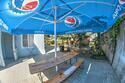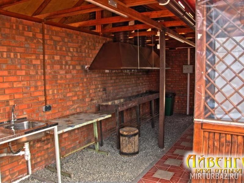 Беседка с собственной мангальной зоной и мойкой, столами и холодильником.