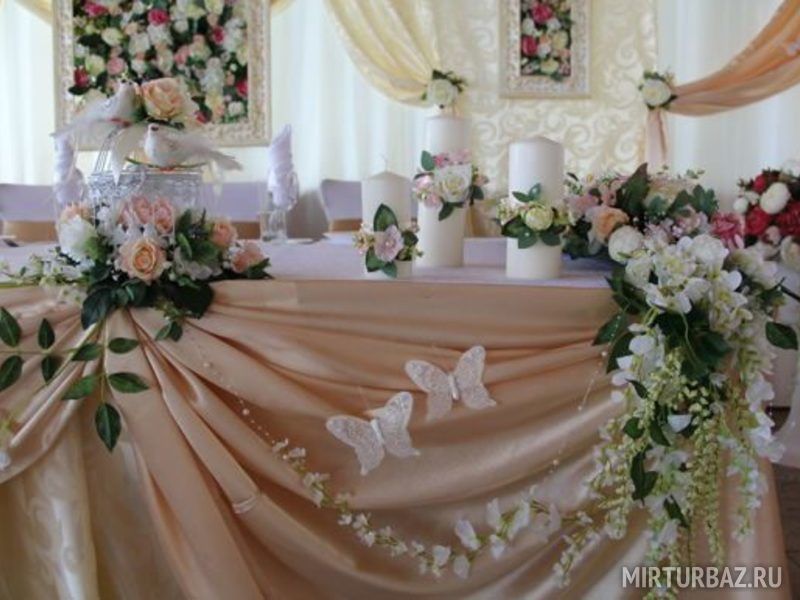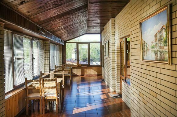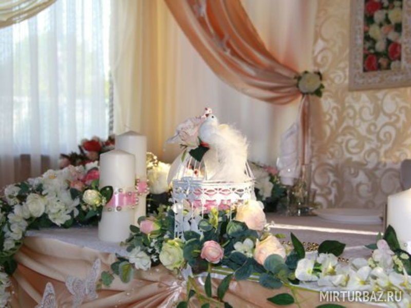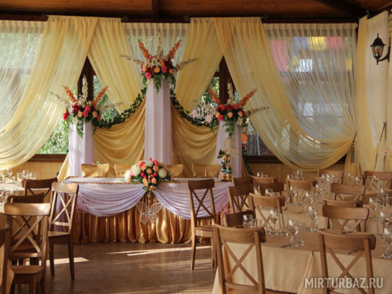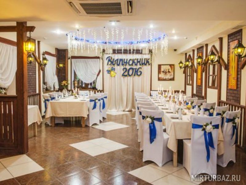 Пол зала вымощен кафелем в бежево-коричневых тонах. Между столиками кафе достаточно места для танцев и праздничных конкурсов. При желании на праздник можно заказывать живую музыку.