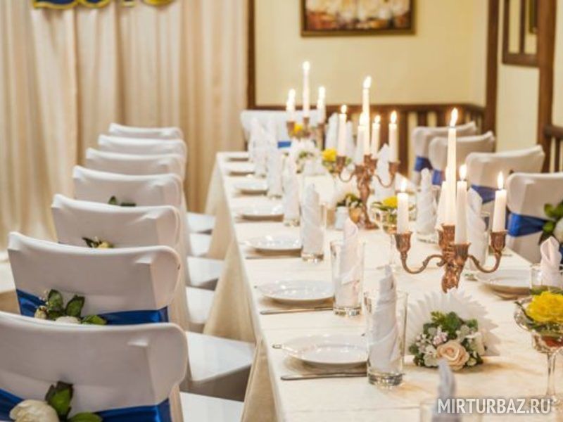 При желании помещение кафе может превращаться в банкетный зал для проведения торжеств (свадьбы, юбилея, любого корпоративного мероприятия и т.д.). Многочисленные столики в кафе сдвигаются «П»-образно с целью организации компактных посадочных мест. Банкетный зал декорируется по желанию заказчика живыми или искусственными цветами, шарами, лентами.