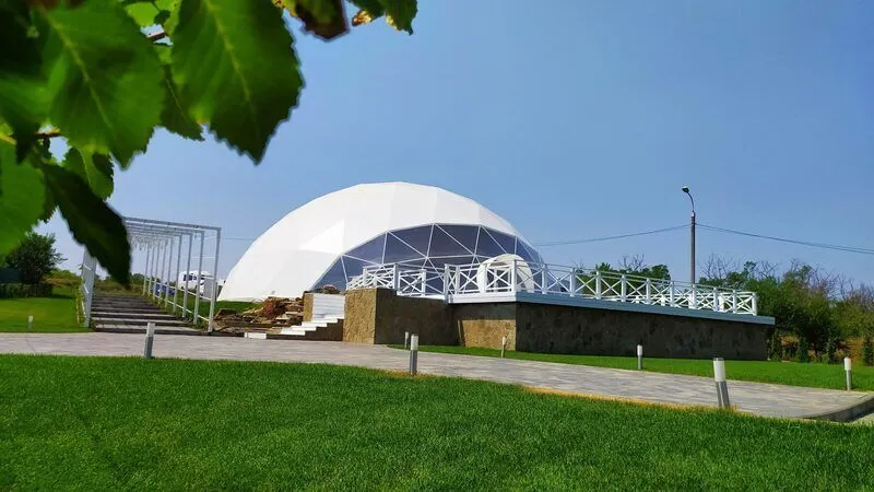 Диаметр 20 м., площадь 314 кв.м., высота купола в высшей точке 8 м. Банкетная посадка 150 чел., театральная посадка 200 чел., фуршетная до 400. Всесезонный. Собственный санузел, сплит система тепло/холод, большое подсобное помещение с собственным санузлом, возможность подключения электрики 380, парковка, выгрузка-погрузка у подсобного помещения. Подходит для свадеб, корпоративов, конференций, фестивалей, шоу, дней рождений.