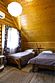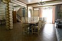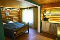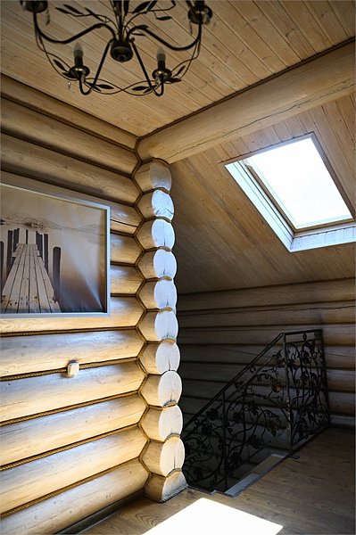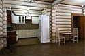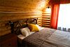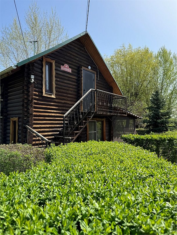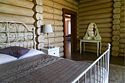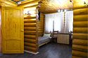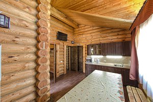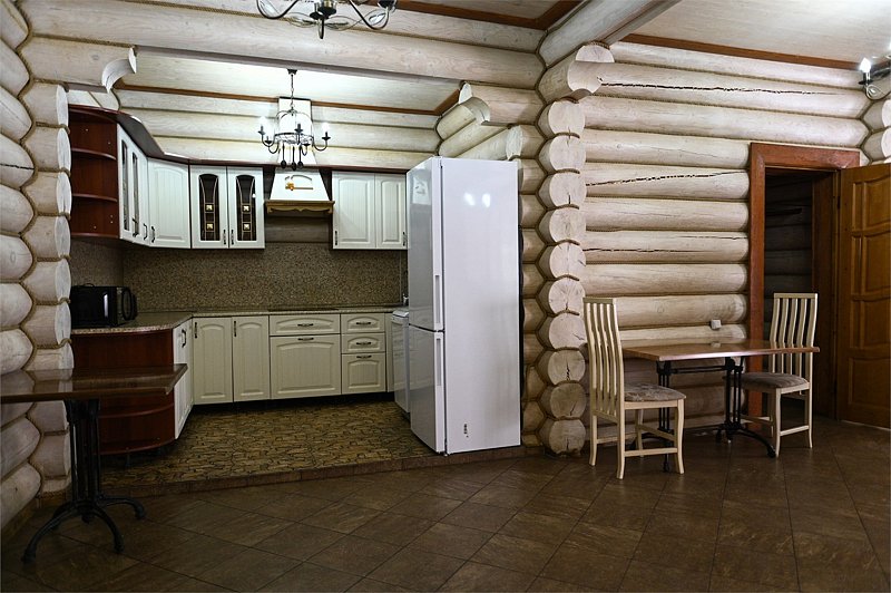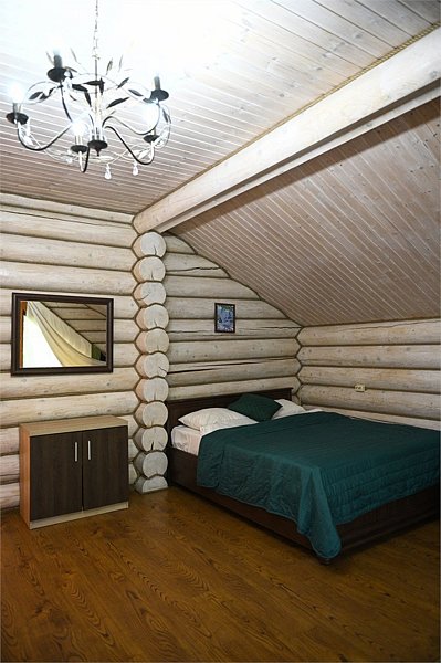 Двухэтажный сруб с одной спальной зоной на первом этаже и двумя спальными зонами на втором этаже. Кухонная зона на первом этаже со всем необходимым для приготовления пищи, террасой перед срубом.