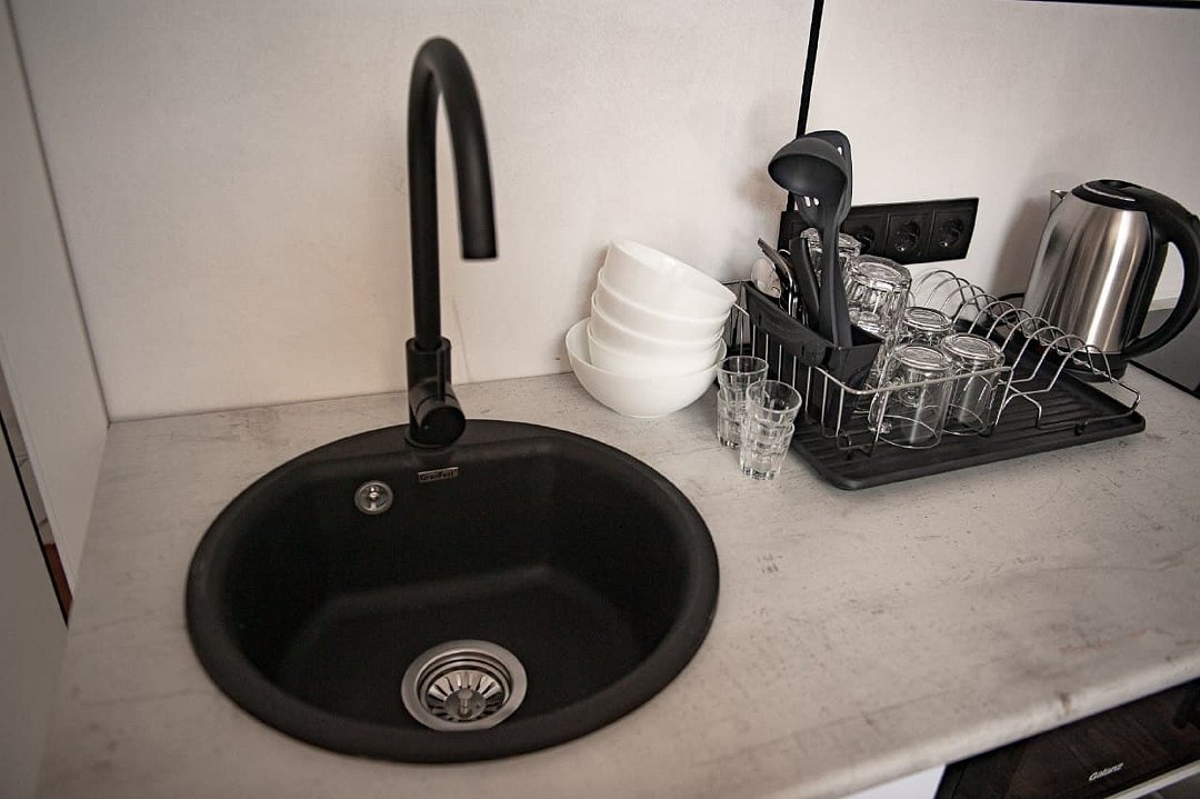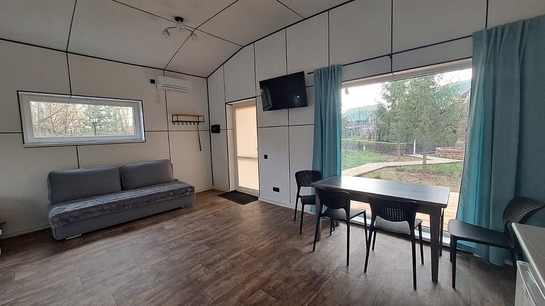 Просторный дом с размещением до четырех человек. Номер-студия, кухонная зона со всем необходимым для приготовления пищи, гостиная, ванная комната, спальная зона.
