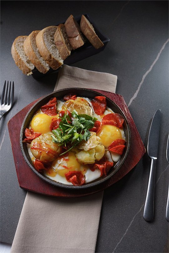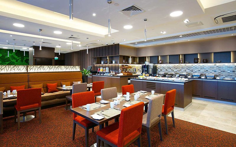 В ресторане сервируются завтраки (с 07:00 до 11:00) с впечатляющим ассортиментом горячих блюд, закусок, свежей выпечки, молочных продуктов, напитков, а также горячей станцией. Вместимость до 65 человек.