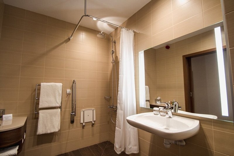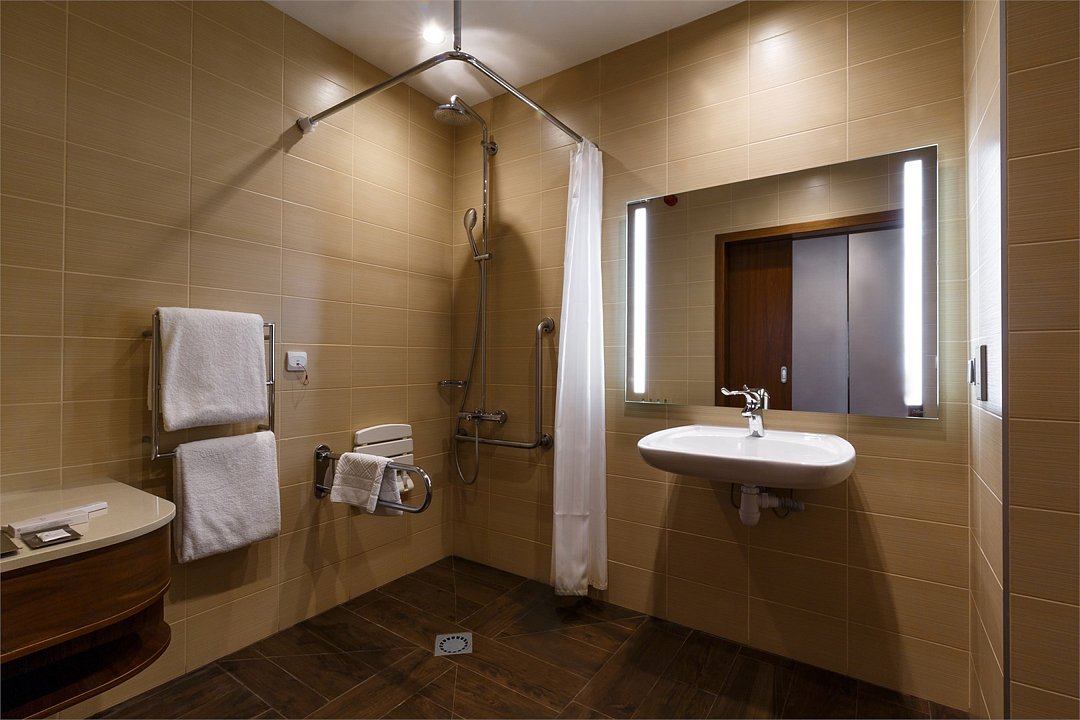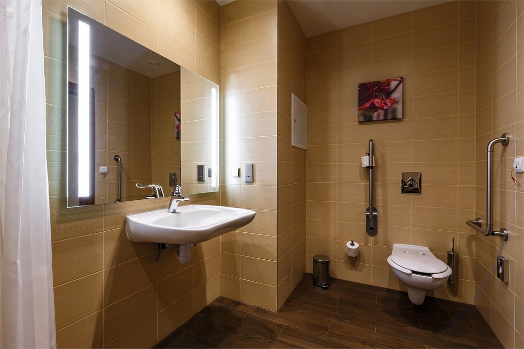 Просторные номера площадью 30 кв.м. оборудованы всем необходимым: расширенными дверными проемами, удобными ванными комнатами, дополнительными поручнями и дверьми в соседний номер для сопровождающих.Услуги и удобства