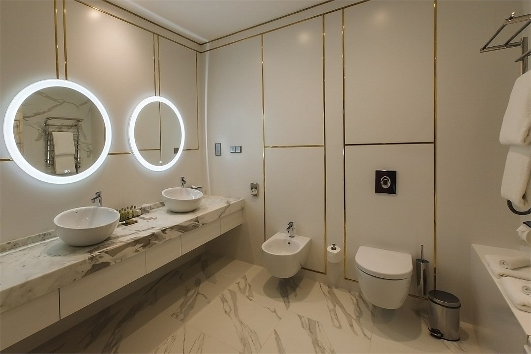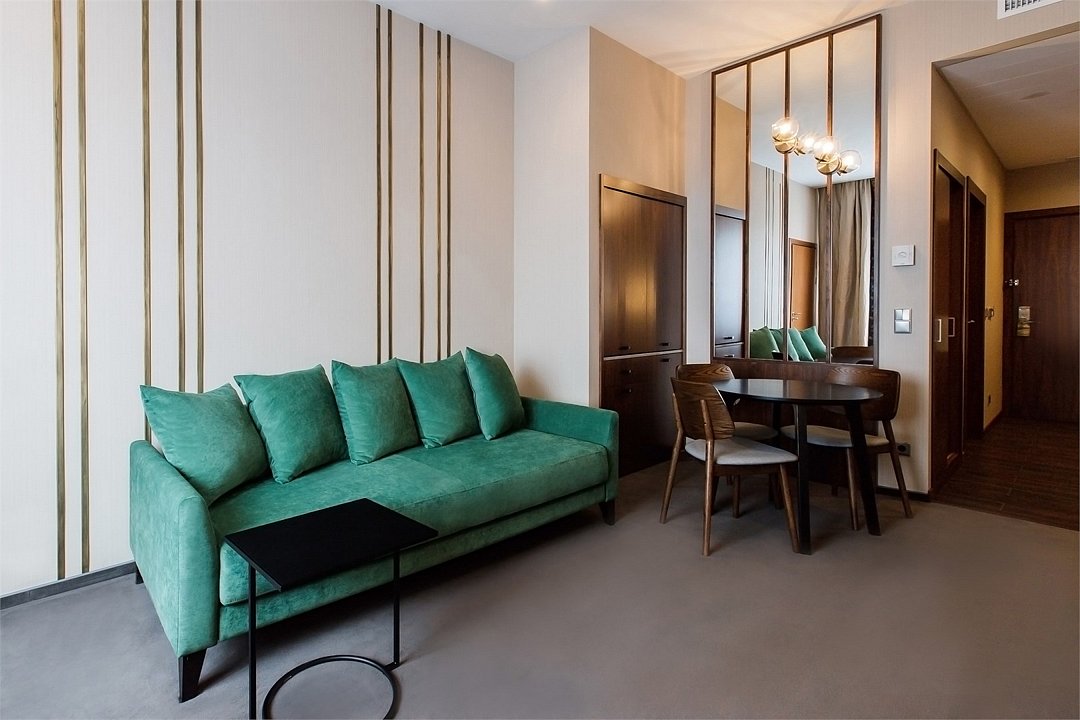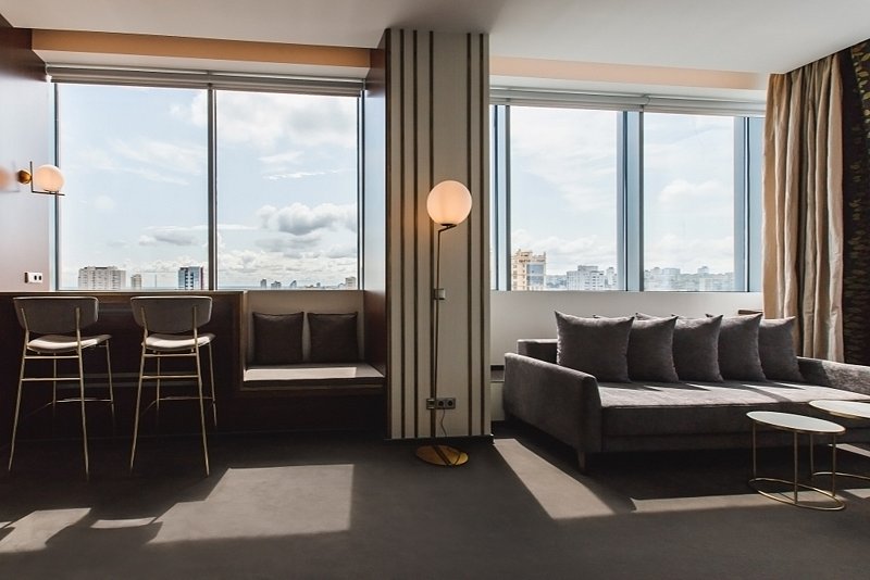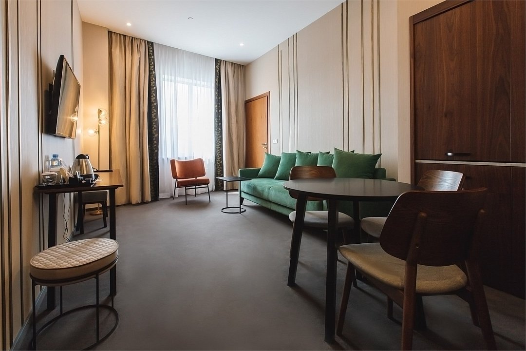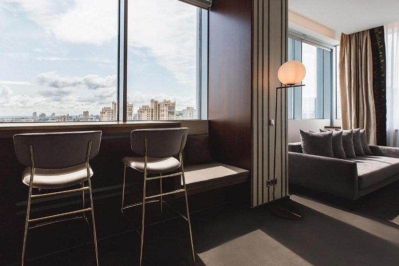телевизор, Wi-Fi, телефон, холодильник, настольные лампы, фен, будильник, кофемашина, утюг, персональный компьютер, ванная комната, ванна, биде, халаты, банные полотенца, тапочки, балкон, кровать «Queen size», гладильная доска, вешалки, журнальный столик, обеденный стол, барная стойка, зеркало, пуфики, ковер, эксклюзивная мебель, две комнаты, звуконепроницаемые стены и окна, чайный набор, обслуживание номеров, информационная карта, меню, сейф, чайник, раковина, гостиная зона, ковровое покрытие, душ, вид на город, вид на реку, кресло, центральное кондиционирование, высокие потолки, стаканы, кофейный столик, стул, тумба, диван-кровать, раскладной диван, мини-холодильник, кухонный уголок, шкаф-купе, номер для некурящих, рабочий стол, можно с питомцамиВ номере
