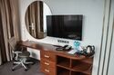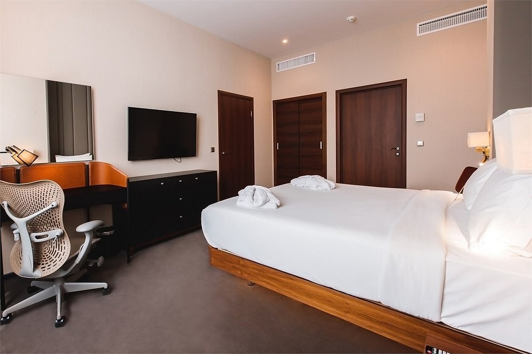 Wi-Fi, телефон, система климат-контроля, настольные лампы, фен, будильник, электронные замки, утюг, ванна, двуспальная кровать, диван, вешалки, письменный стол, зеркало, вид на город, стул, телевизор с плоским экраном, шкаф-купе, пуфик, можно с питомцамиВ номере