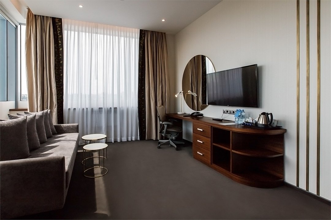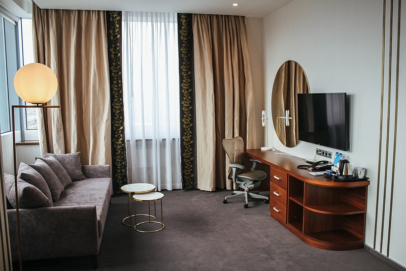 Wi-Fi, телефон, система климат-контроля, будильник, электронные замки, утюг, кровать «King size», гладильная доска, журнальный столик, зеркало, обслуживание номеров, чайник, ковровое покрытие, душ, вид на город, центральное кондиционирование, телевизор с плоским экраном, мини-холодильник, шкаф-купе, пуфик, рабочий стол, можно с питомцамиВ номере