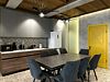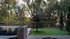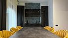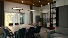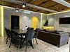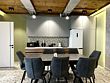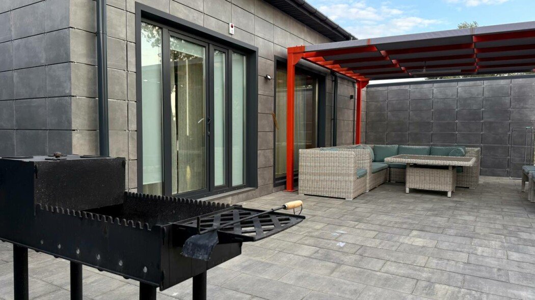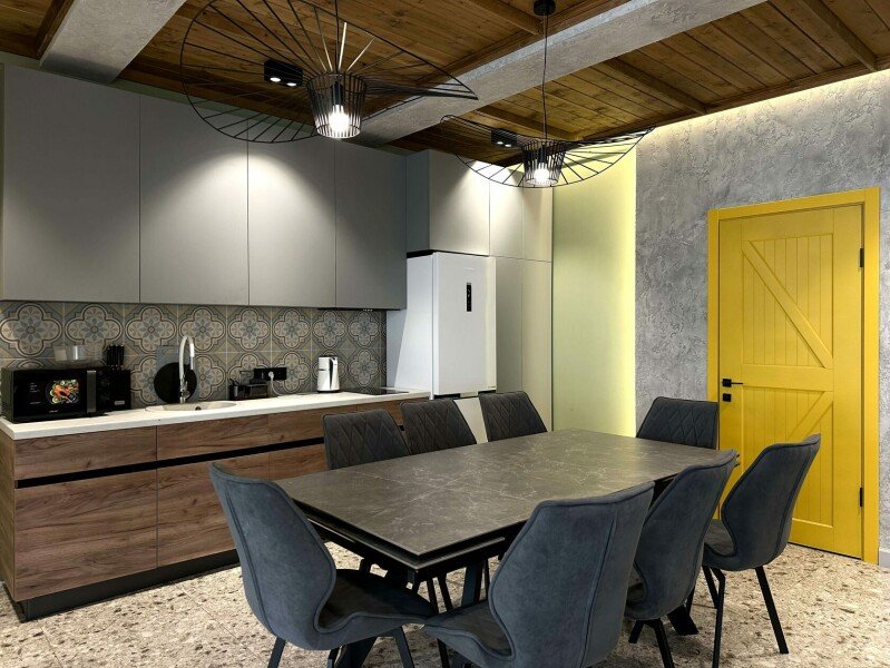 Обеденная зона с двумя большими столами, кухонный уголок — холодильник, плита, чайник, микроволновка. Терраса с мебелью, мангальная зона. В доме единое пространство без спален. Рабочее пространство, дополнительные подушки и одеяла.