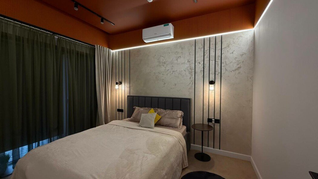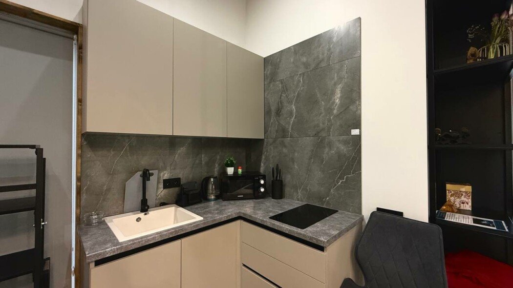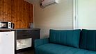 2 спальни, кухня-гостиная: раскладной диван, кухонный уголок, чайник, холодильник, микроволновка, плита, рабочее пространство.