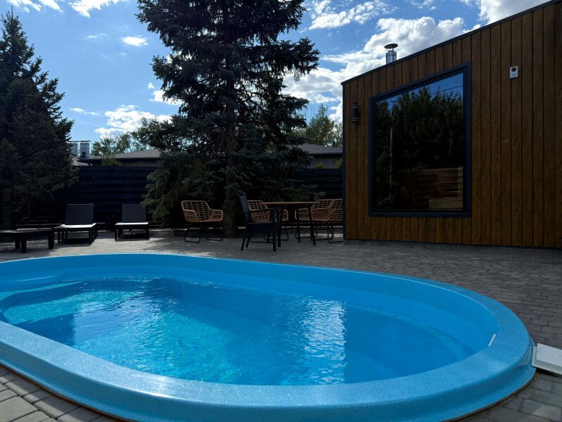 1 спальня, кухня-гостиная: раскладной диван, кухонный уголок, чайник, холодильник, микроволновка, плита. Собственная баня и бассейн. Терраса с мебелью и мангальная зона.