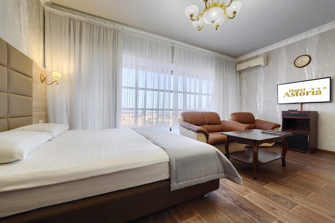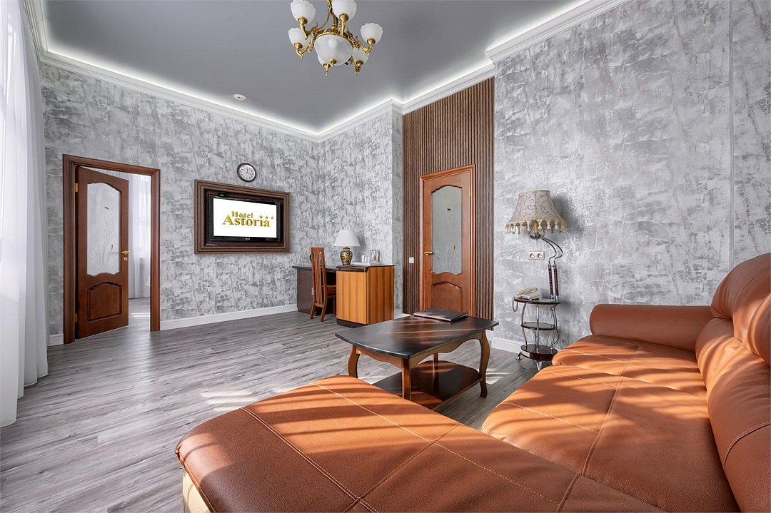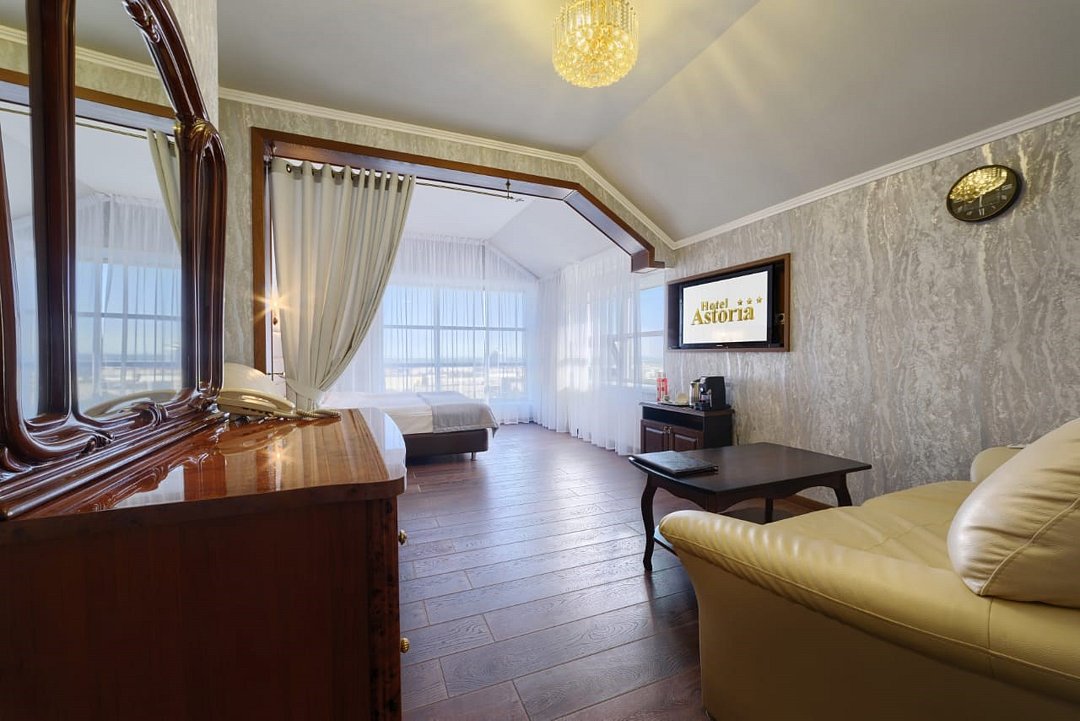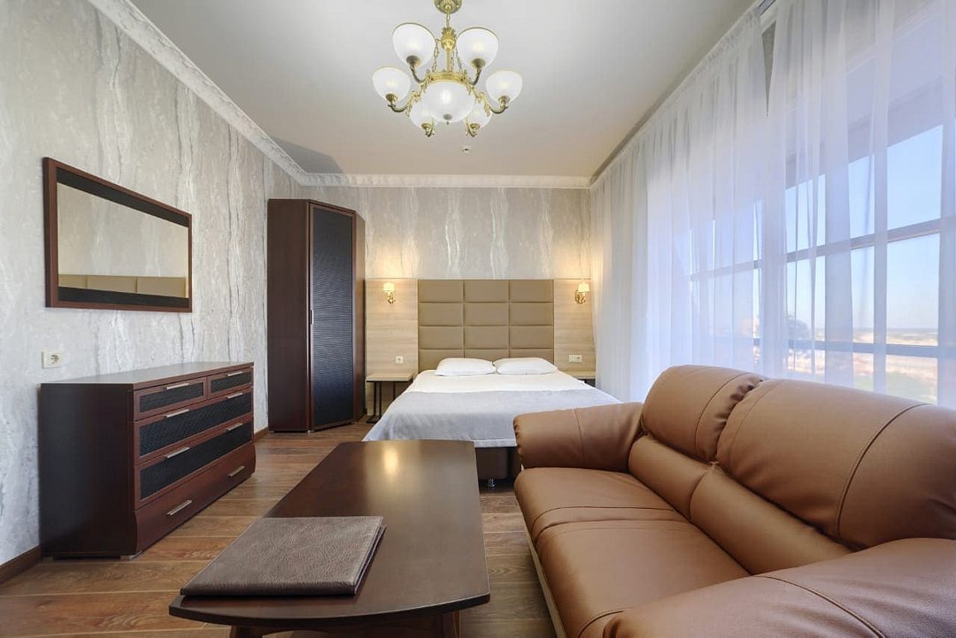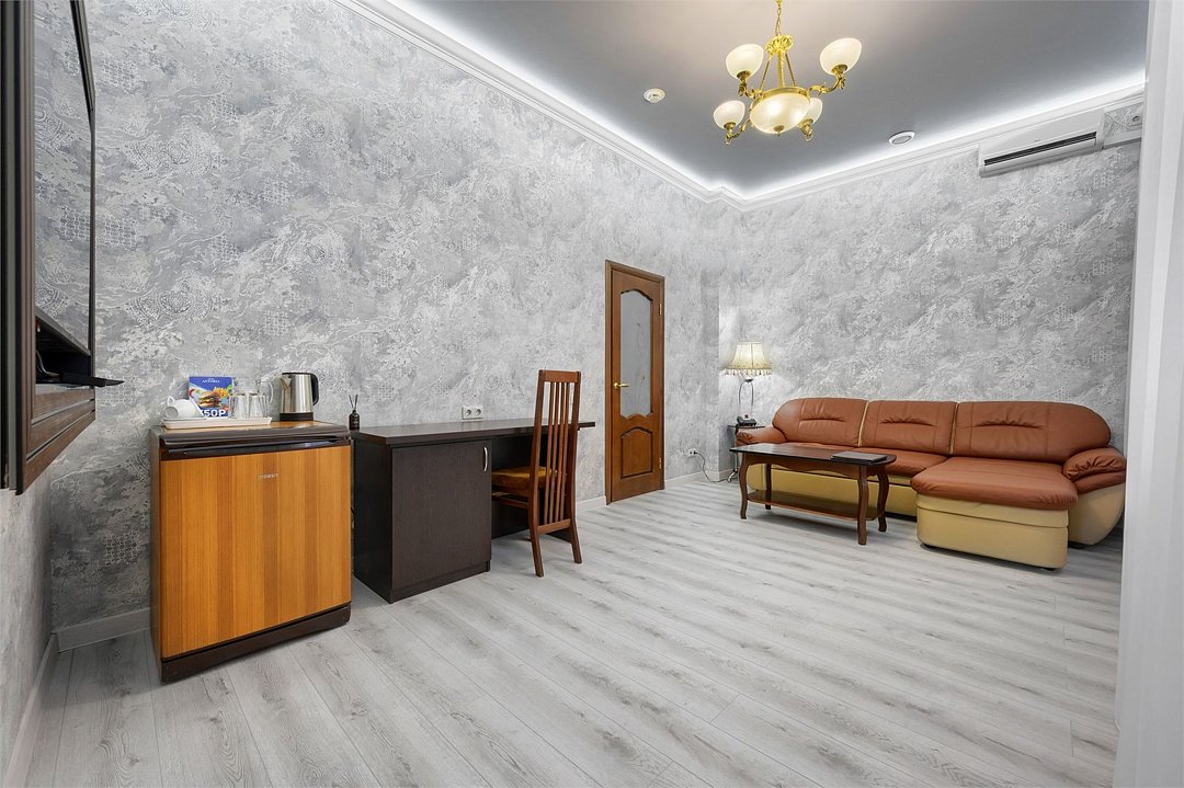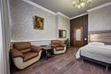 Эксклюзивный дизайн двухкомнатного номера люкс дарит ощущение VIP клиента. Просторная гостиная с большим кожаным диваном, журнальным столиком, и телевизором удобна не только для отдыха, но и для непринужденной встречи «без галстуков», а также необходимой работы в деловой поездке. Номер предназначен и для семейного размещения до четырех человек. Двуспальная кровать для родителей и раскладывающийся диван в гостиной для детей - удобное решение для полноценного отдыха семьи. Джакузи и климат контроль – особая привилегия в летнюю жару.Услуги и удобства